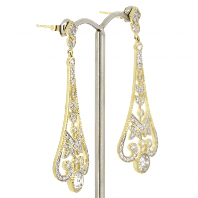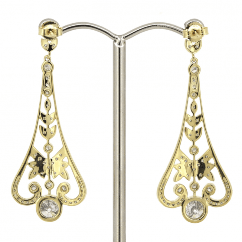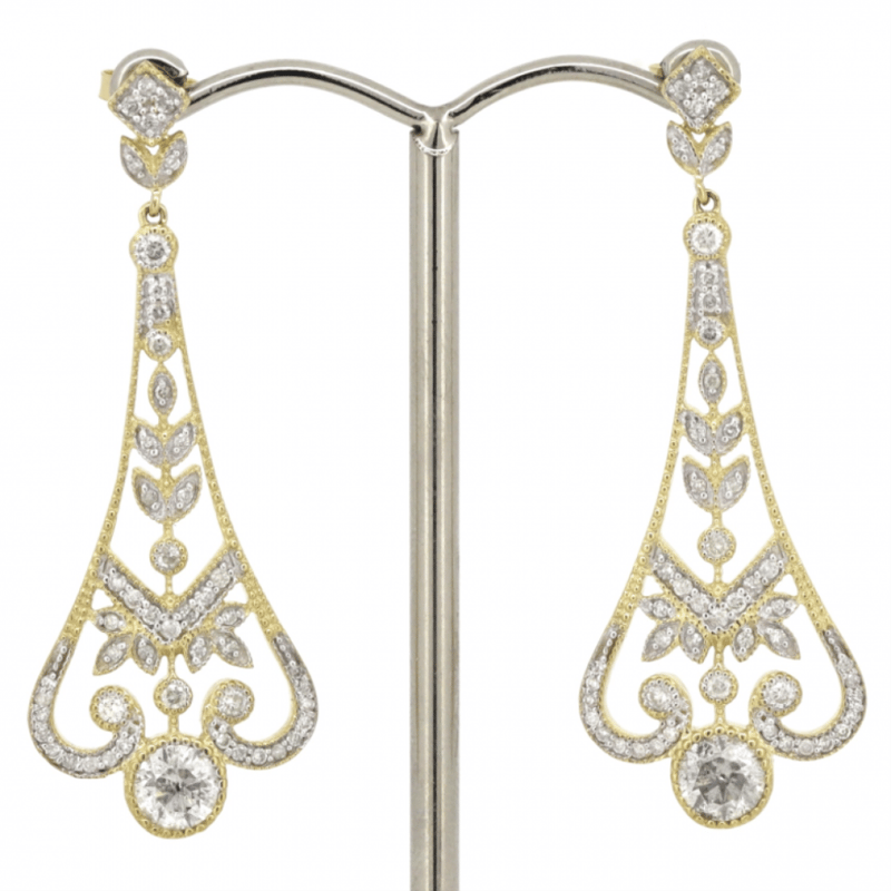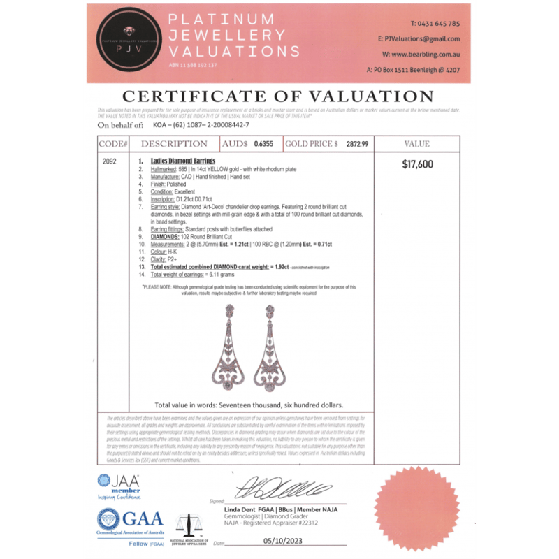 14K YELLOW GOLD AND DIAMOND, ART DECO INSPIRED DROP EARRINGS The Design Features, 102 Round Brilliant Cut, Diamonds (1.92Ct Tdw, H-K Colour, P2+ Clarity), Bezel/Bead Set With Millegrain Detail. The Earrings Have Post Backs, With 14K Yellow Gold Butterfly Clasps. Jewellery Valuations Provided By A Third Party Professional Not Directly Associated With Lloyds Auctions at AUD $$17,600.00This Insurance Valuation has been provided by a registered Jewellery Valuer and is intended for insurance purposes only. The valuation amount has no bearing on the auction value of the item. Any questions regarding the valuation should be directed to the issuing Valuer (refer to contact details on the certificate) as Lloyds have no association or relationship with the Valuer or the valuation amount contained within the valuation. Condition: NEW 0645875+5263