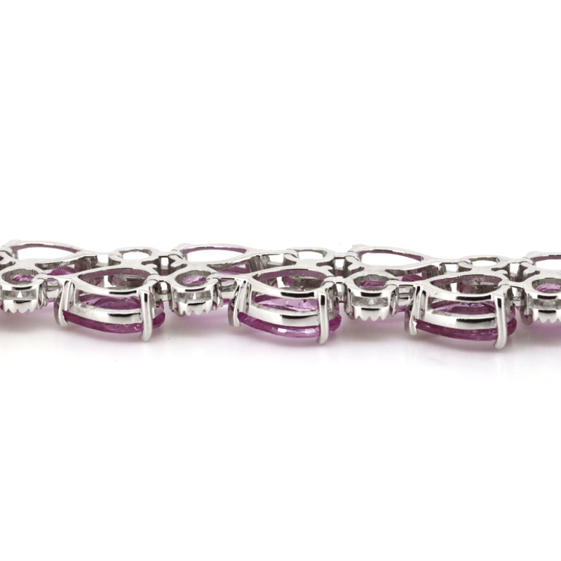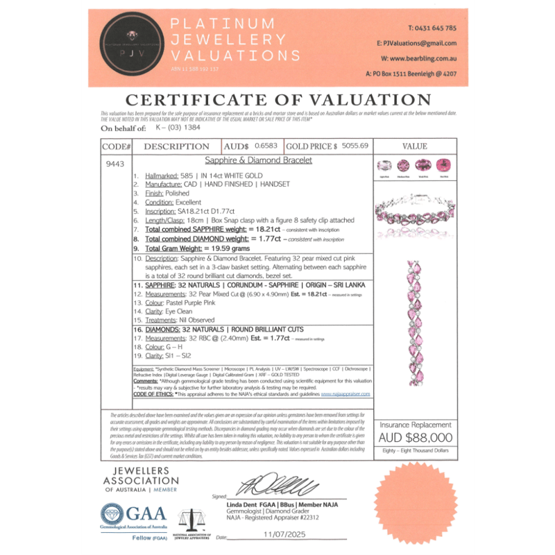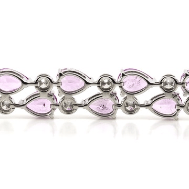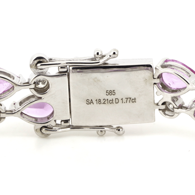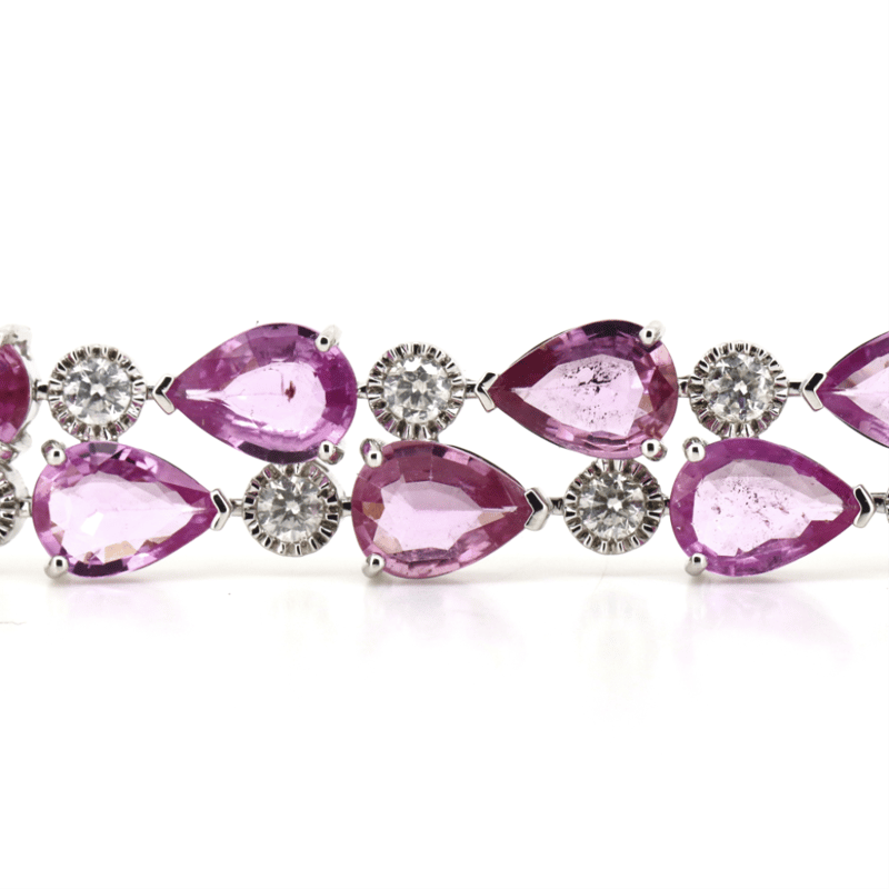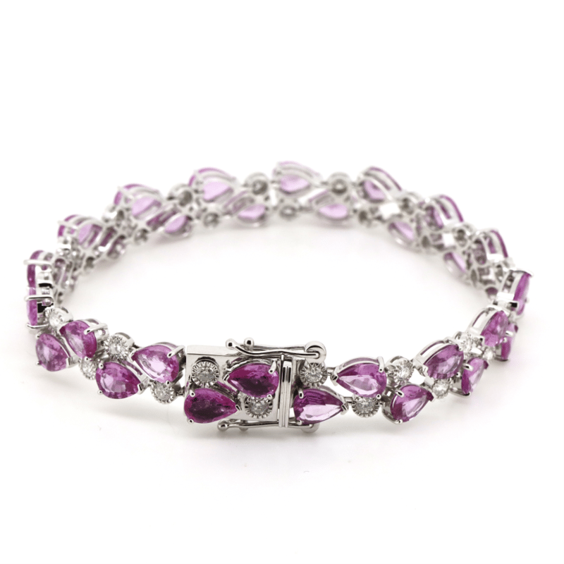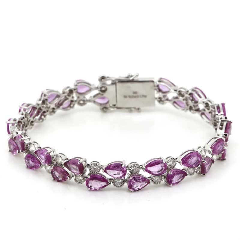 14K WHITE GOLD, PINK SAPPHIRE AND DIAMOND, ALTERNATING BRACELET The Design Features, 32 Pear Mixed Cut, Pastel Purplish Pink, Sapphires (18.21Ct Tsw, Eye Clean Clarity), Claw Set. Alternating Between Are, 32 Round Brilliant Cut, Diamonds (1.77Ct Tdw, G-H Colour, Si1-Si2 Clarity), Claw Set. The Design Is Set In 2 Alternating Rows. The Bracelet Has A Box Lock Closure With 2 'Figure Eight' Safety Catches. Bracelet Length Is 18Cm. Jewellery Valuations Provided By A Third Party Professional Not Directly Associated With Lloyds Auctions at AUD $$88,000.00This Insurance Valuation has been provided by a registered Jewellery Valuer and is intended for insurance purposes only. The valuation amount has no bearing on the auction value of the item. Any questions regarding the valuation should be directed to the issuing Valuer (refer to contact details on the certificate) as Lloyds have no association or relationship with the Valuer or the valuation amount contained within the valuation. Condition: NEW 0645875+5211