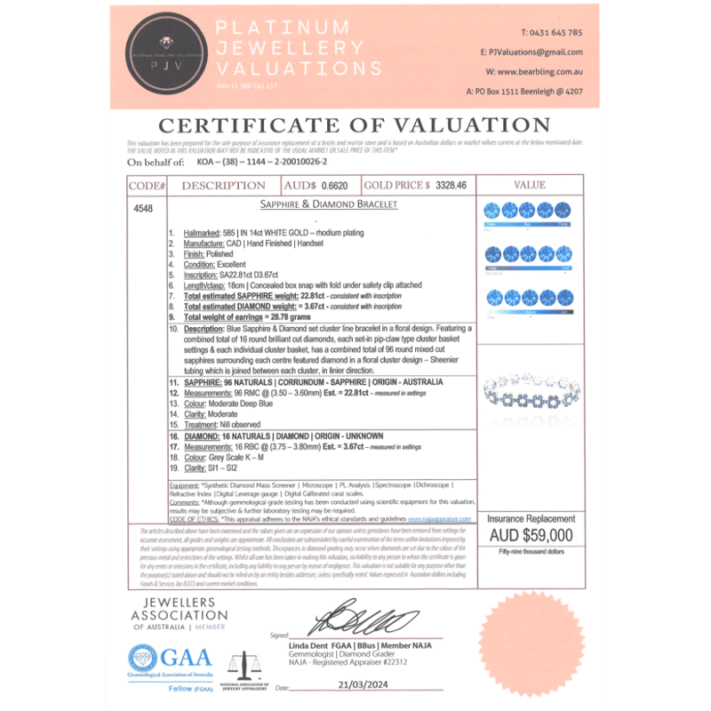 This Insurance Valuation has been provided by a registered Jewellery Valuer and is intended for insurance purposes only. The valuation amount has no bearing on the auction value of the item. Any questions regarding the valuation should be directed to the issuing Valuer (refer to contact details on the certificate) as Lloyds have no association or relationship with the Valuer or the valuation amount contained within the valuation.