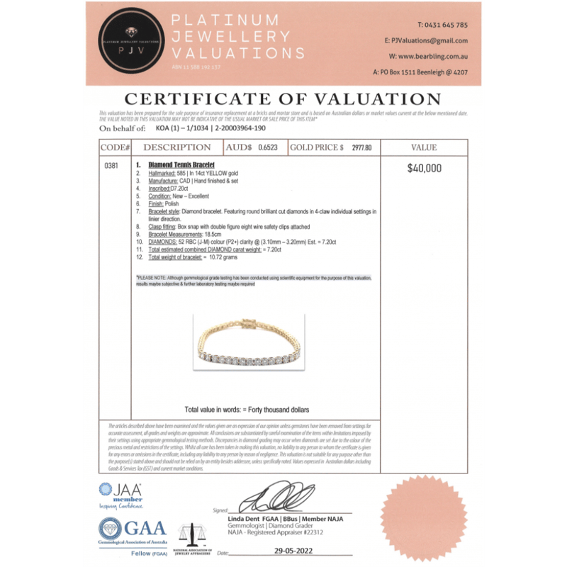 This Insurance Valuation has been provided by a registered Jewellery Valuer and is intended for insurance purposes only. The valuation amount has no bearing on the auction value of the item. Any questions regarding the valuation should be directed to the issuing Valuer (refer to contact details on the certificate) as Lloyds have no association or relationship with the Valuer or the valuation amount contained within the valuation.