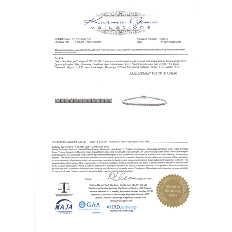14K WHITE GOLD, 3.00CT TDW DIAMOND, TENNIS BRACELET The Design Features, 66 Round Brilliant Cut, Diamonds (3.00Ct Tdw, K-M Colour, Vs-Si Clarity), 4-Claw Set. The Bracelet Has A Box Clasp With Double Figure 8 Clasps. Bracelet Length Is 18Cm. Jewellery Valuations Provided By A Third Party Professional Not Directly Associated With Lloyds Auctions at AUD $$37,500.00This Insurance Valuation has been provided by a registered Jewellery Valuer and is intended for insurance purposes only. The valuation amount has no bearing on the auction value of the item. Any questions regarding the valuation should be directed to the issuing Valuer (refer to contact details on the certificate) as Lloyds have no association or relationship with the Valuer or the valuation amount contained within the valuation. Condition: NEW 0645875+5216