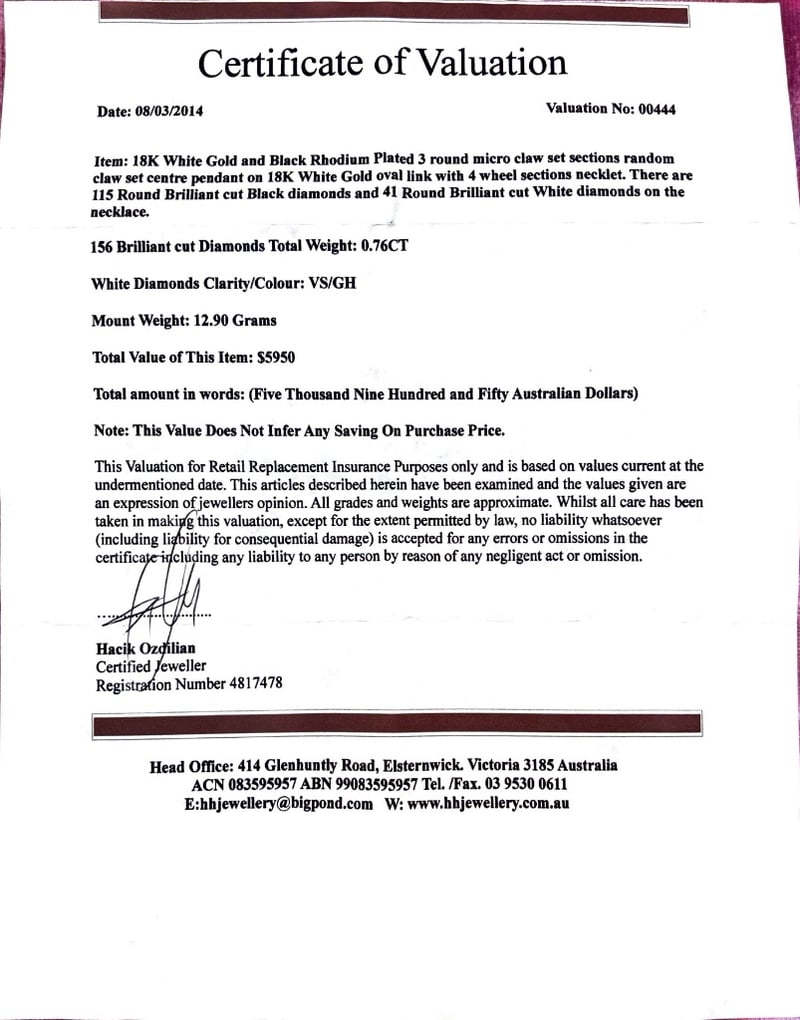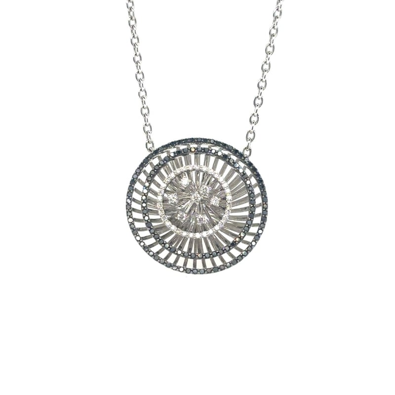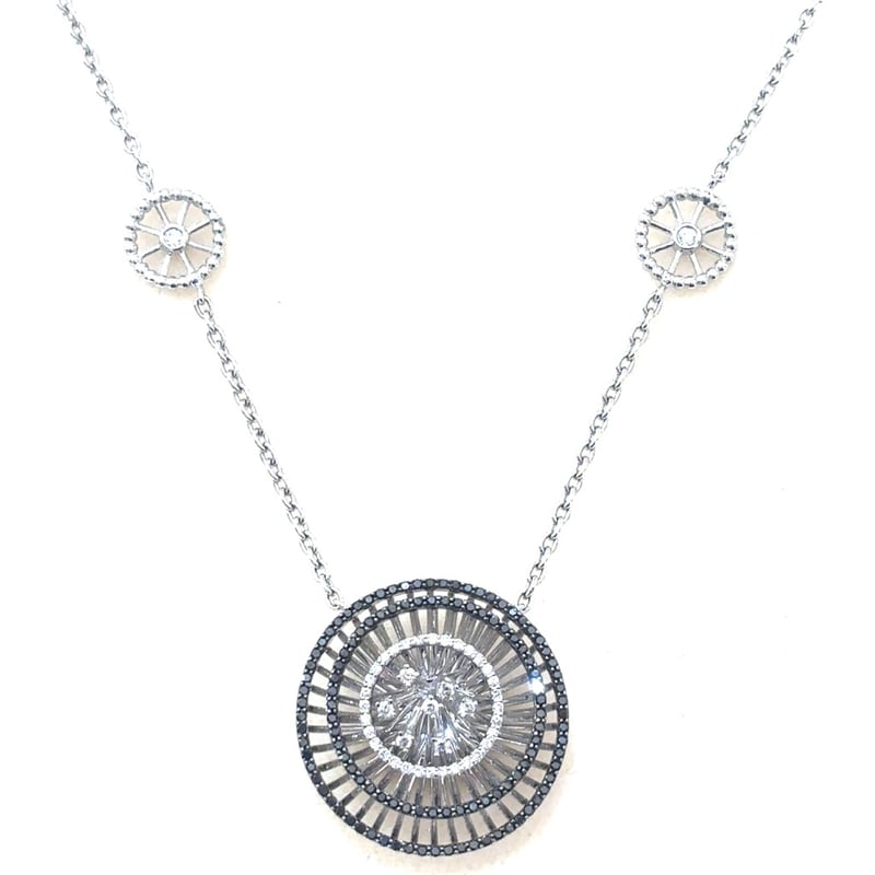 18K WHITE GOLD AND BLACK RHODIUM PLATED PENDANT ON 18K WHITE GOLD NECKLET18K White Gold And Black Rhodium Plated 3 Round Micro Claw Set Sections Random Claw Set Centre Pendant On 18K White Gold Oval Link With 4 Wheel Sections Necklet. There Are 115 Round Brilliant Cut Black Diamonds And 41 Round Brilliant Cut White Diamonds On The Necklace. 156 Brilliant Cut Diamonds Total Weight: 0.76Ct White Diamonds Clarity/Colour: Vs/Gh Mount Weight: 12.90 GramsTotal Item Weight: 12.90gCondition: Good - Refer To ImagesInsurance Replacement Valuation Amount: $5,950.00CROSSDOCK162897+22