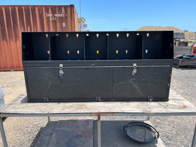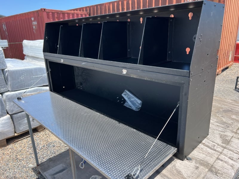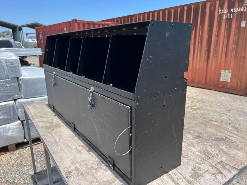 Robust Aluminium tool/parts locker ideal for Utes, workshops, construction sites and service vehicles. Features a large top compartment with multiple divider bays and keyhole mounting points for tools, cans or accessories. Lower section includes a full-width lockable drop-down door with dual padlock hasps for secure storage of larger items.