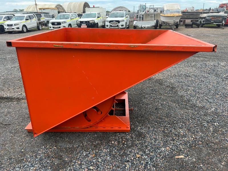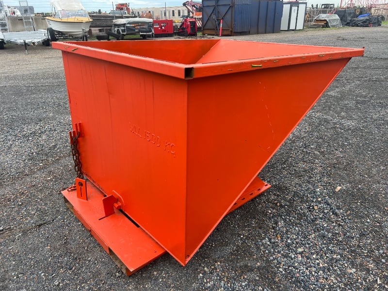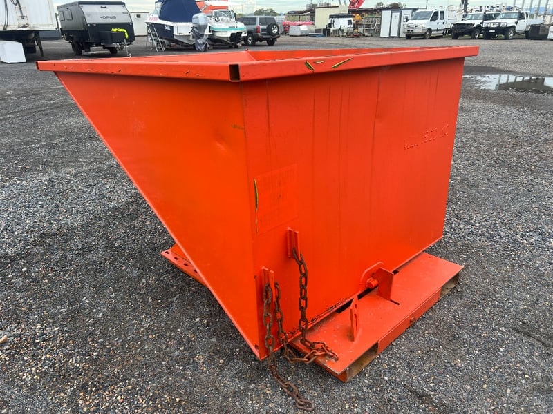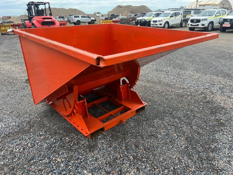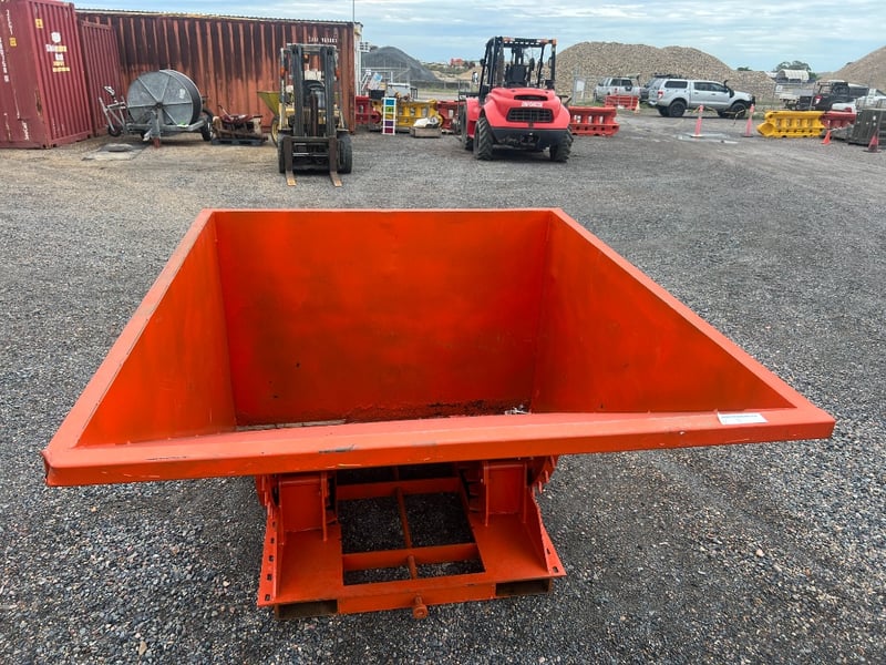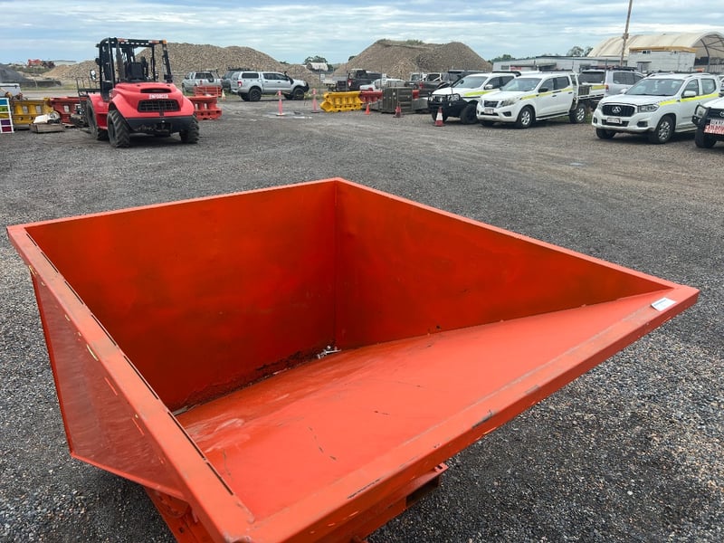Type: Industrial self-dumping hopper, designed for forklift handling.