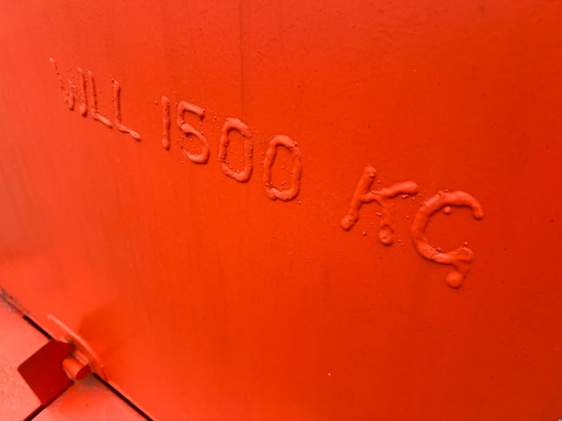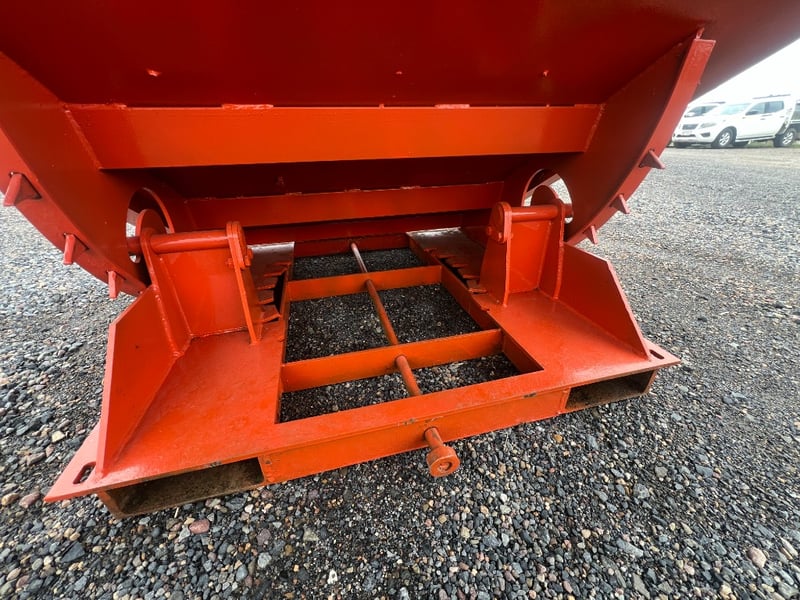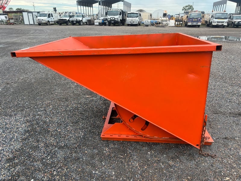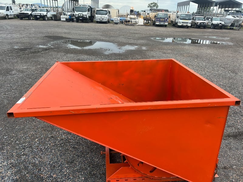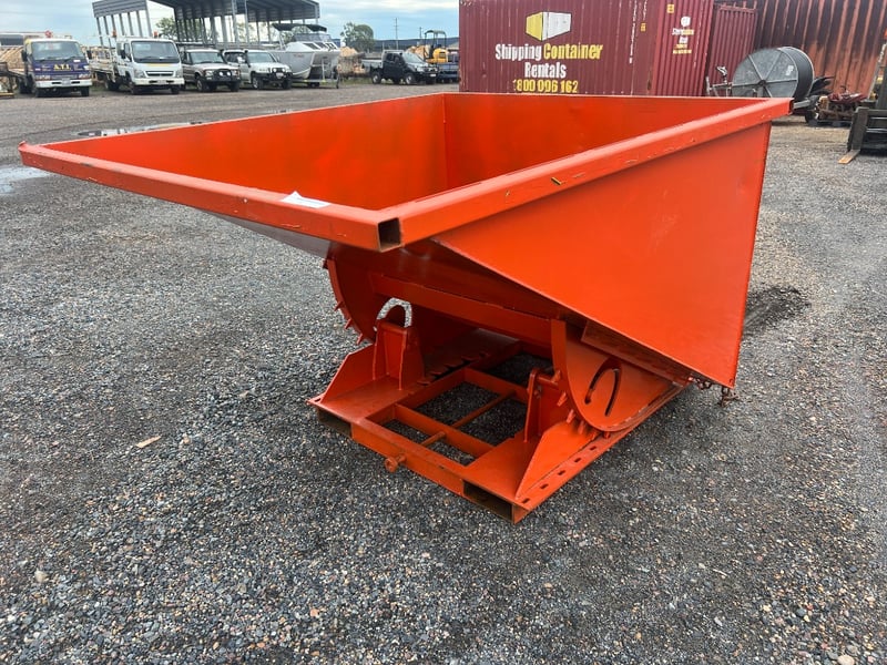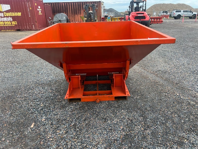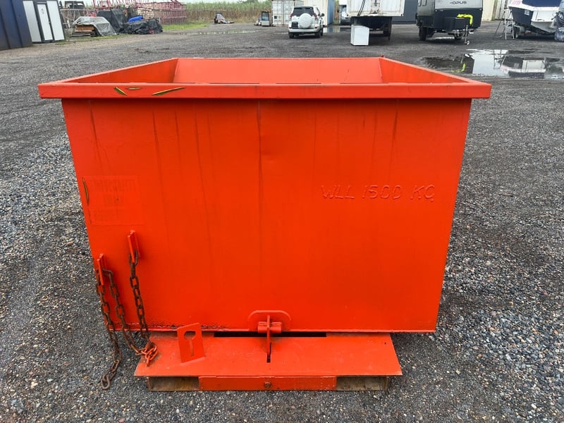 Type: Industrial self-dumping hopper, designed for forklift handling.