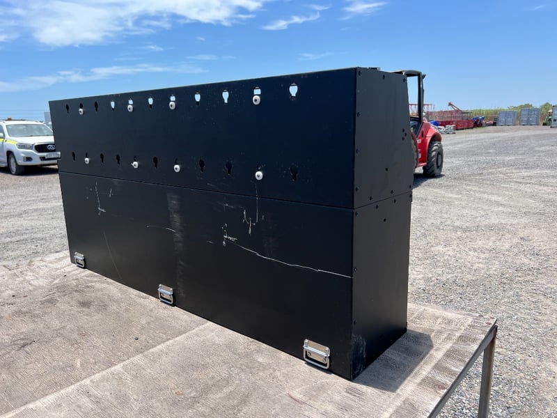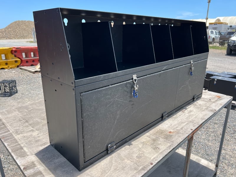 Robust Aluminium tool/parts locker ideal for Utes, workshops, construction sites and service vehicles. Features a large top compartment with multiple divider bays and keyhole mounting points for tools, cans or accessories. Lower section includes a full-width lockable drop-down door with dual padlock hasps for secure storage of larger items.