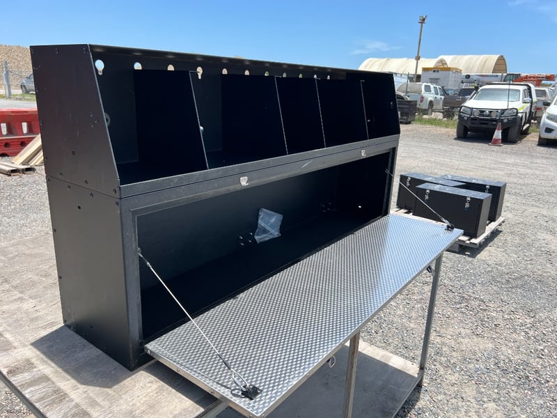 Robust Aluminium tool/parts locker ideal for Utes, workshops, construction sites and service vehicles. Features a large top compartment with multiple divider bays and keyhole mounting points for tools, cans or accessories. Lower section includes a full-width lockable drop-down door with dual padlock hasps for secure storage of larger items.