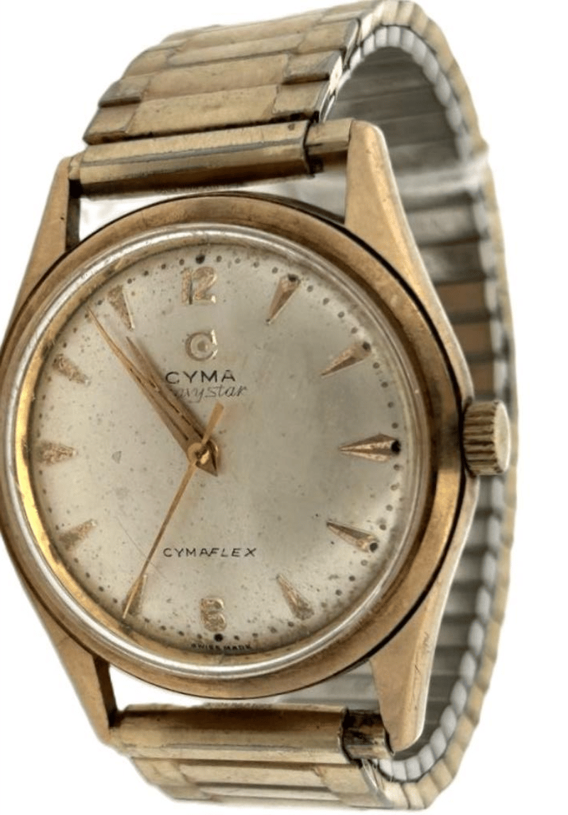 CYMA NAVYSTAR CYMAFLEX 9CT GOLD 1960 VINTAGE WATCH, LIGHT GOLD COLOUR DIAL WITH GOLD-TONE NUMERICAL/POINTED BATON HOUR MARKERS, CASE MEASURES 34MM, MANUAL WIND MOVEMENT, SWISS MADE, GOLD-TONE STAINLESS STEEL STRETCH BRACELET, CIRCA 1960. NOTE: PATINA ON DIAL/ENGRAVING ON BACK OF CASE. Condition: Good - Refer To Images