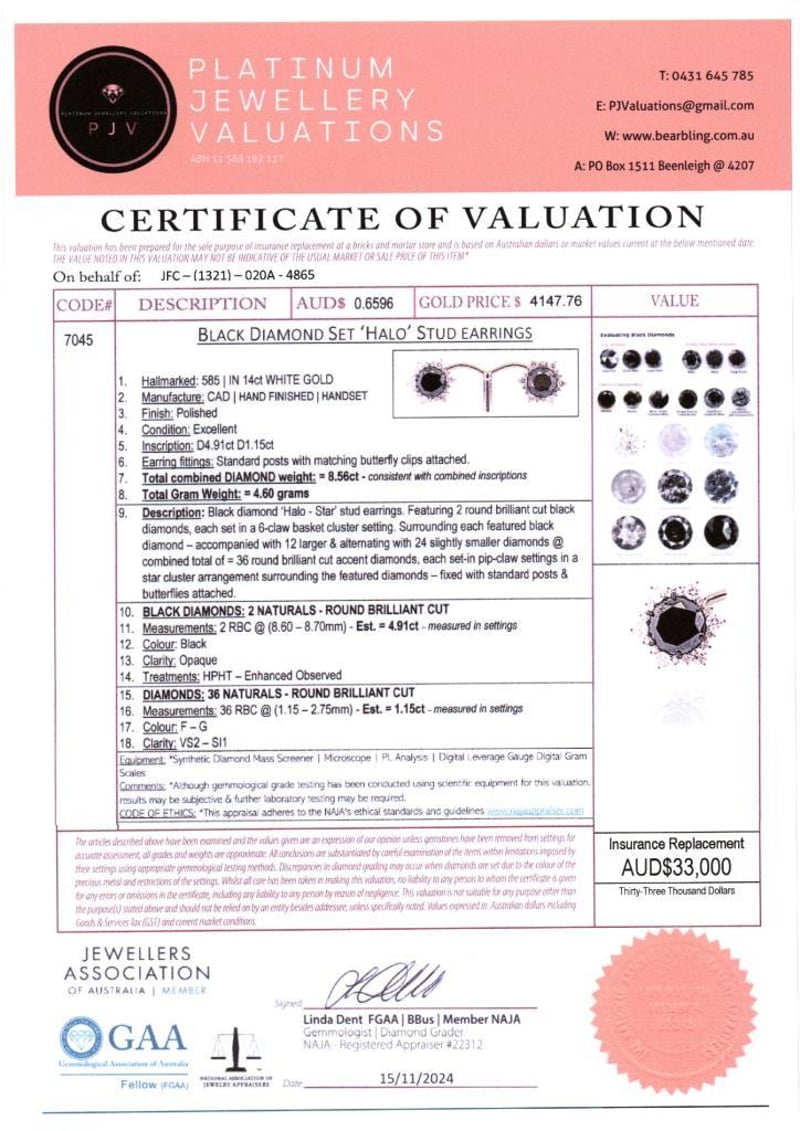 14CT WHITE GOLD BLACK DIAMOND HALO STUD EARRINGS 14Ct White Gold Black Diamond Halo Stud Earrings Featuring Centre, 2 Round Brilliant Cut, Black Diamonds (4.91Ct Tdw, Opaque, Enhanced), Claw Set, With 36 Round Brilliant Cut Diamonds (1.15Ct Tdw, F-G Colour, Vs2-Si1 Clarity), Claw Set. Jewellery Valuations Provided By A Third Party Professional Not Directly Associated With Lloyds Auctions at AUD $33000This Insurance Valuation has been provided by a registered Jewellery Valuer and is intended for insurance purposes only. The valuation amount has no bearing on the auction value of the item. Any questions regarding the valuation should be directed to the issuing Valuer (refer to contact details on the certificate) as Lloyds have no association or relationship with the Valuer or the valuation amount contained within the valuation. 0586264+574