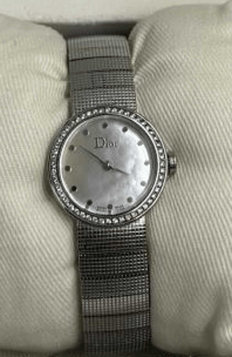 DIOR BABY D LADIES DIAMOND WATCH, MODEL CD041111, MOTHER-OF-PEARL DIAL WITH DIAMOND-SET BEZEL AND DOT HOUR MARKERS, CASE MEASURES 24MM, WR 3 ATM, SWISS MADE, QUARTZ MOVEMENT, STAINLESS STEEL GUILLOCHÉ BRACELET WITH FOLDING CLASP, INCLUDES ORIGINAL DIOR BOX AND PAPERS. Condition: Good - Refer To Images