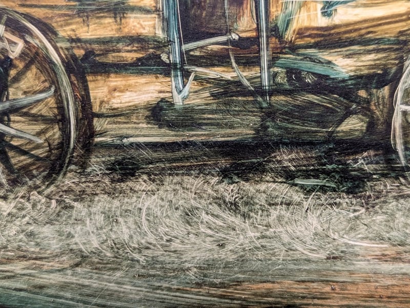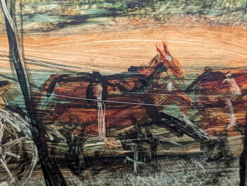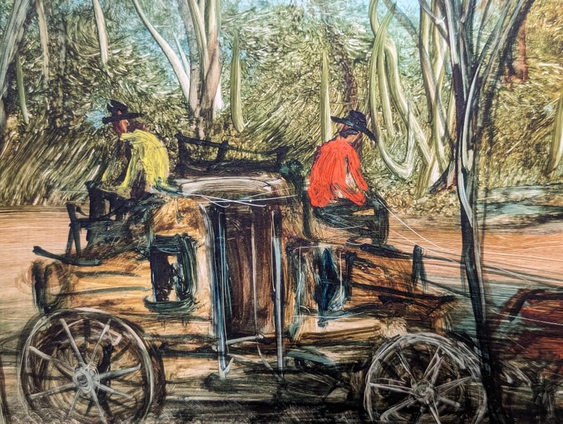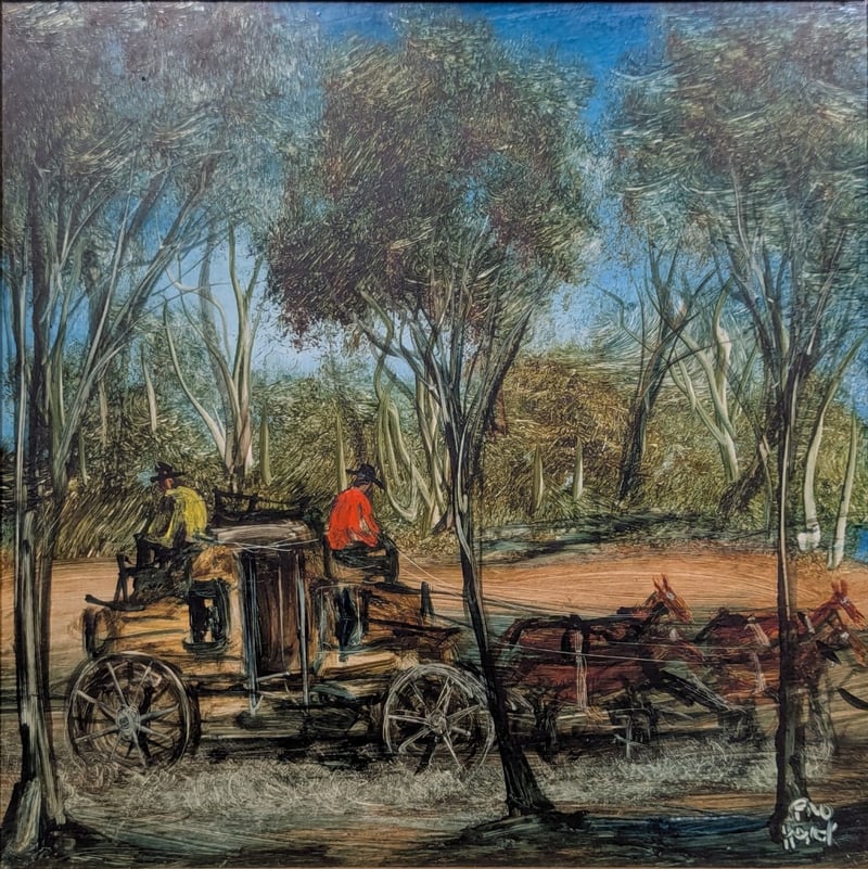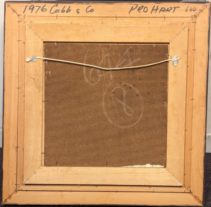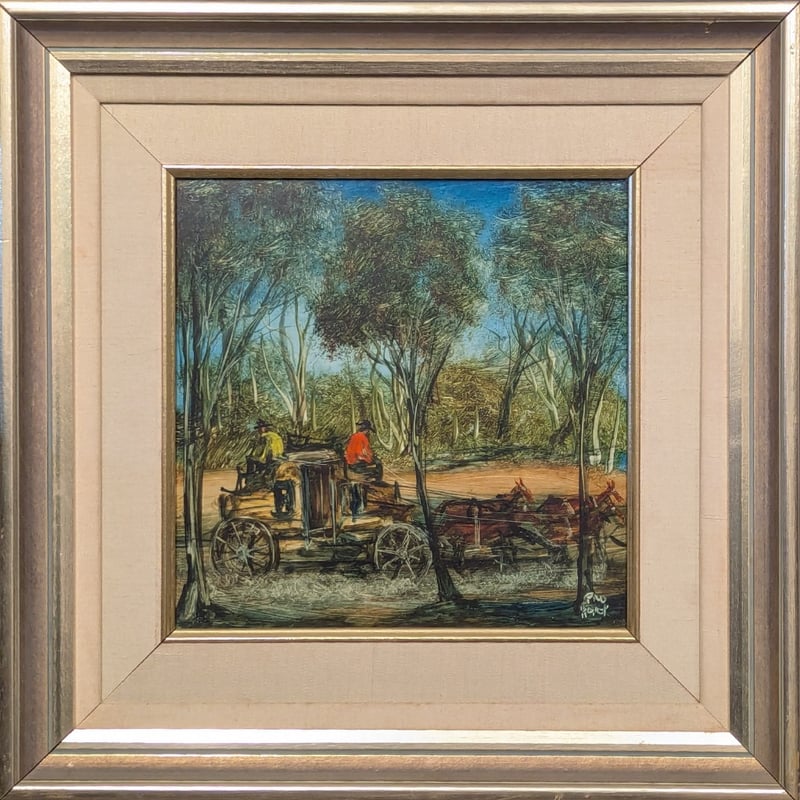 PRO HART (1928 - 2006) Original Oil Painting On Board Title: 1976 Cobb & Co Image Size: 30cm x 29cm Frame Size: 51cm x 51cm Signature Details: Signed Lower Right Condition: Good - Refer To Images 585014+3