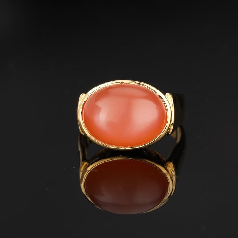 Enchanting Peach Moonstone Cabochon RingDiscover the allure of ethereal beauty with this exquisite Peach Moonstone cabochon ring. At the heart of this stunning piece lies a mesmerizing 16x12mm oval gemstone, radiating soft, peachy hues that dance delicately with the light. The ring's height of 6.10mm adds a subtle elevation, allowing the stone's captivating shimmer to take center stage. Crafted with precision, the smooth cabochon finish enhances the stone's natural glow, making it a perfect statement piece for both day and evening wear. The warm tones of the peach moonstone evoke feelings of tranquility and harmony, inviting you to embrace your inner goddess. Set in a meticulously designed band that complements the stone's unique character, this ring promises to be a conversation starter, a cherished addition to any jewelry collection, or a timeless gift for someone special. Elevate your elegance and indulge in the enchanting charm of this Peach Moonstone cabochon ring, where nature's artistry and luxury converge.