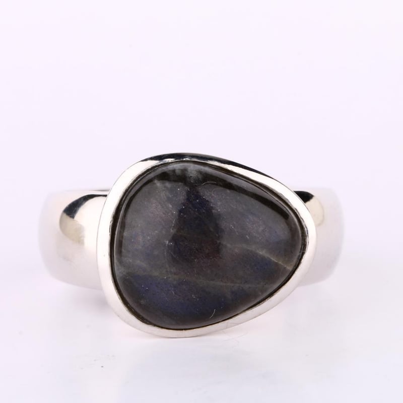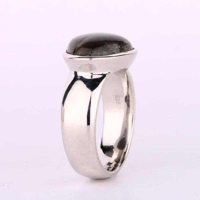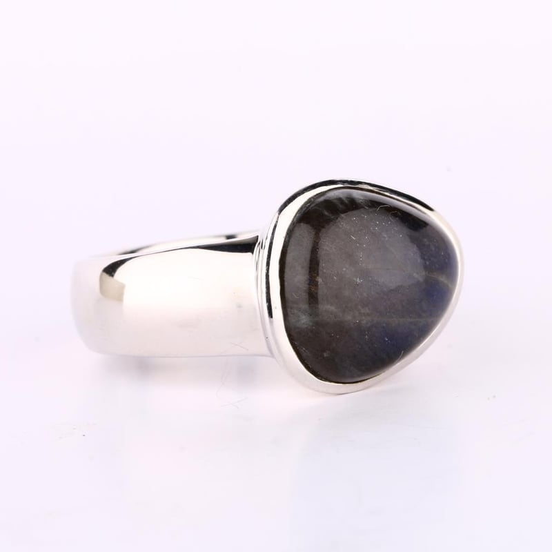 Enchanting Labradorite Cabochon Ring in Brushed FinishStep into a realm of elegance with this exquisite ring, featuring a stunning labradorite cabochon that commands attention with its captivating play of color. Measuring 14x12mm and standing at a height of 5.00mm, this fancy-shaped gem is a true testament to nature’s artistry, showcasing iridescent hues that dance with light, evoking the mystery of twilight skies.Crafted with a brushed texture that adds a contemporary edge, the ring is further enhanced by high-polished collet top areas and an impeccably finished inside shank, ensuring both comfort and brilliance. This unique combination of finishes creates a striking contrast, highlighting the labradorite's ethereal glow while offering a modern twist to classic sophistication.Whether worn as a statement piece at a gala or as an everyday symbol of elegance, this ring promises to elevate any ensemble. Don’t miss your chance to own this masterpiece that beautifully blends natural wonder with artisanal craftsmanship.
