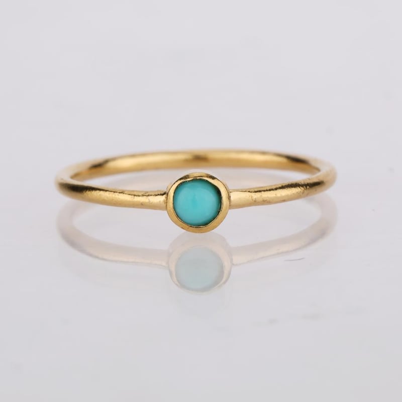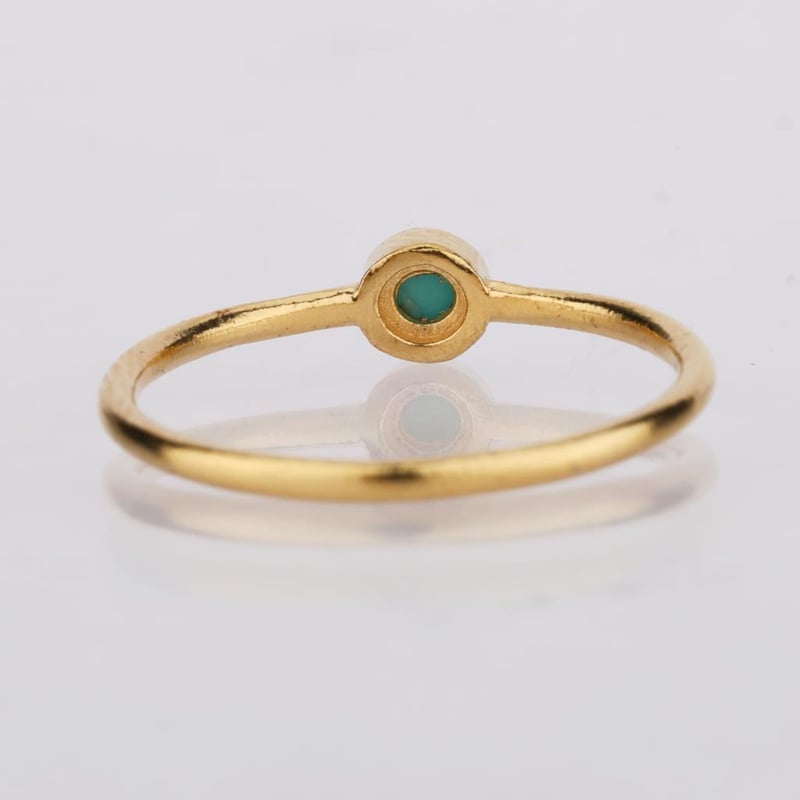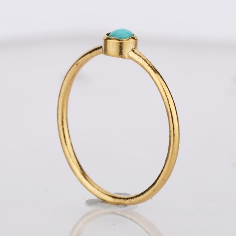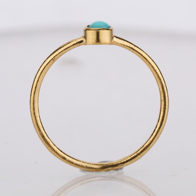Exquisite Turquoise Cabochon Ring – A Touch of Timeless EleganceStep into a world of sophistication with this enchanting ring featuring a stunning round turquoise cabochon, measuring a perfect 3.00mm. Crafted with meticulous attention to detail, this piece embodies the essence of luxury and style. The vibrant hue of the turquoise exudes a serene charm, reminiscent of tranquil ocean waters and sunlit skies, making it a captivating addition to any jewelry collection.The band, with a delicate thickness of 1.30mm, elegantly complements the striking gemstone, ensuring a comfortable yet secure fit. Expertly polished to a high shine, this ring catches the light beautifully, showcasing the natural beauty of the turquoise at every angle. Enhanced with magnetic qualities, this piece not only dazzles but also serves as a meaningful talisman, believed to promote healing and protection.Perfect for both everyday wear and special occasions, this ring is a testament to timeless elegance and modern sophistication, making it an exquisite gift for yourself or a loved one. Elevate your jewelry collection with this stunning turquoise cabochon ring and embrace the allure of its captivating beauty.
