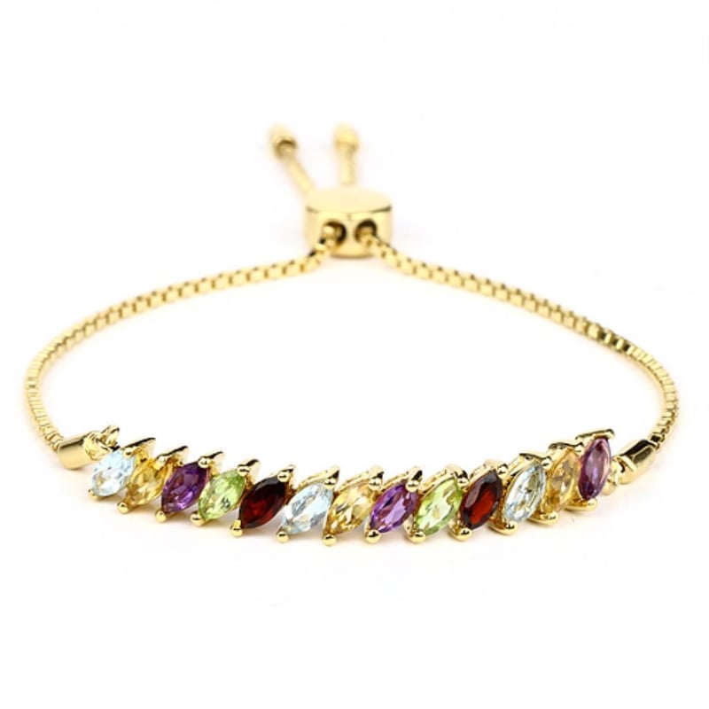 Radiant Harmony: Multi-Stone Marquise Bracelet CollectionIndulge in the exquisite allure of our Radiant Harmony bracelet collection, a symphony of vibrant gemstones expertly crafted to capture the essence of elegance and sophistication. This stunning assembly features a captivating array of marquise-cut gems, each measuring 6x3mm, that dance in a kaleidoscope of colors, bringing to life the beauty of nature’s finest treasures.At the heart of this collection lies the deep, regal hues of African Amethyst, three scintillating pieces that evoke the tranquility of twilight skies. Accompanied by the sparkling brilliance of Blue Topaz, these gems reflect the serene depths of ocean waters, creating a harmonious contrast that enchants the eye.Adding a touch of warmth and sunshine, the three marquise-cut Citrine stones infuse the bracelet with a golden glow reminiscent of sunlit days, while the rich tones of Garnet and Peridot add depth and vibrancy to this luxurious ensemble. With two pieces of each, these stones harmonize beautifully, representing passion and renewal.This bracelet collection is not merely a piece of jewelry; it is an exquisite statement of identity and style, perfect for the discerning collector who appreciates the artistry of fine craftsmanship. Whether worn alone for a striking statement or layered with other treasures, the Radiant Harmony bracelet collection will elevate any ensemble to new heights of glamour and sophistication. Embrace the beauty of this unique gemstone combination and let your style shine as brightly as the gems themselves. Don’t miss the opportunity to own a piece that embodies the elegance of nature and the artistry of human design.