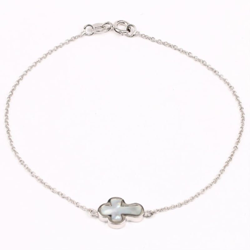 Embrace elegance with this stunning bracelet featuring a beautifully crafted Mother of Pearl plate cross, measuring 10x6.50mm. This exquisite piece radiates a soft, iridescent glow, capturing the enchanting subtleties of natural light and reflecting the beauty of its surroundings.