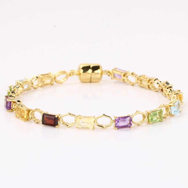 Adding warmth and vibrancy, five luscious citrines are artfully interspersed throughout, their golden tones reminiscent of sunlit afternoons, infusing the bracelet with a joyful glow. Two rich garnets, embodying passion and strength, provide a striking contrast, while two enchanting peridots, with their lush green sparkle, complete the ensemble with a touch of verdant elegance.