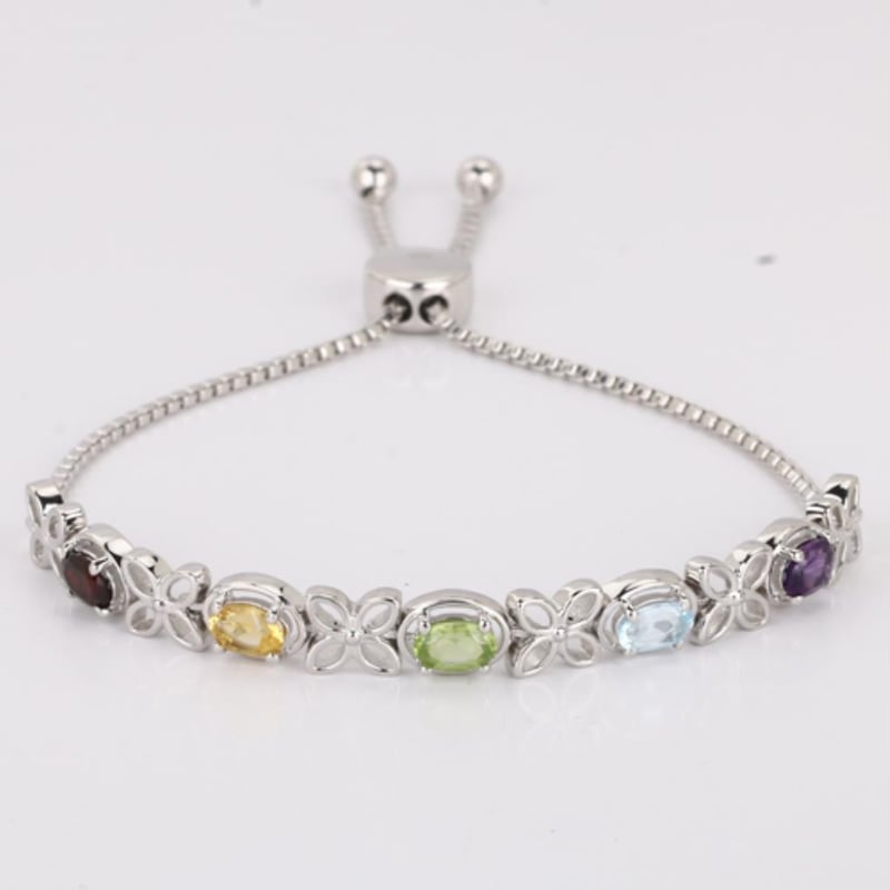 Indulge in the vibrant allure of this exquisite bracelet, masterfully designed to showcase a harmonious blend of nature's finest treasures. Each oval gemstone measures a delicate 6x4mm, thoughtfully curated to create a stunning visual symphony that dances with color and light.