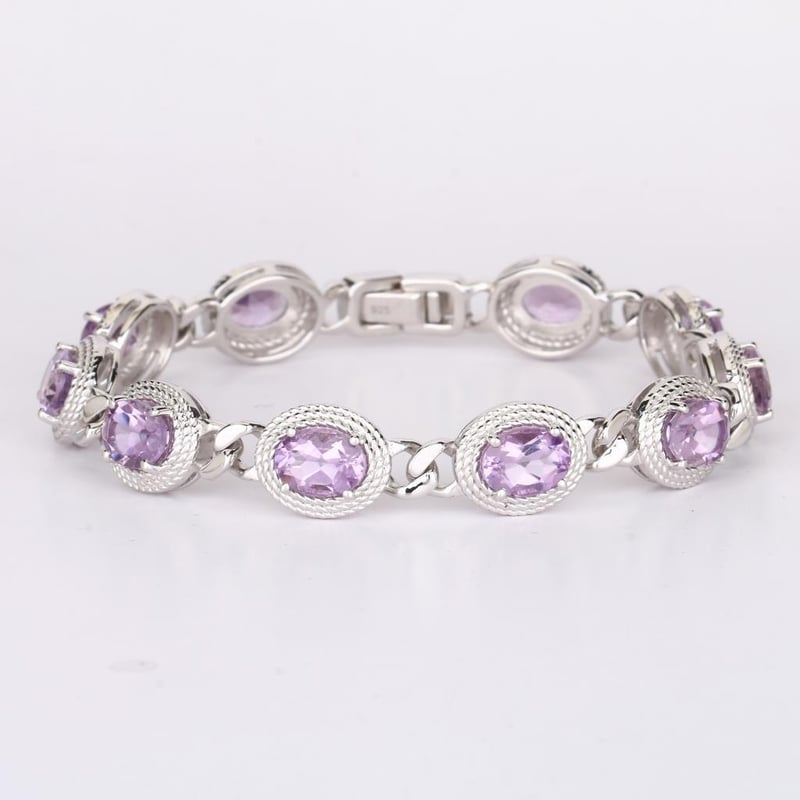 Exquisite Brazilian Amethyst Bracelet with 10 Oval GemstonesIndulge in the allure of our stunning bracelet, featuring ten beautifully crafted oval Brazilian amethyst stones, each measuring 8x6mm. The deep, rich purple hues of these exquisite gems evoke a sense of royalty and elegance, making this bracelet a perfect statement piece for any occasion. Meticulously set in a delicate yet durable design, this bracelet harmoniously blends the natural beauty of the amethyst with a refined aesthetic that speaks to the sophistication of its wearer. The vibrant clarity and unique character of each stone are further enhanced by the gentle glimmer of the surrounding metalwork, creating a captivating interplay of light and color. Whether worn alone or stacked with other treasured pieces, this amethyst bracelet is not just a piece of jewelry; it's a treasure that embodies luxury and timeless charm. Elevate your collection or gift it to someone special, and let this exquisite bracelet be a lasting reminder of elegance and beauty.