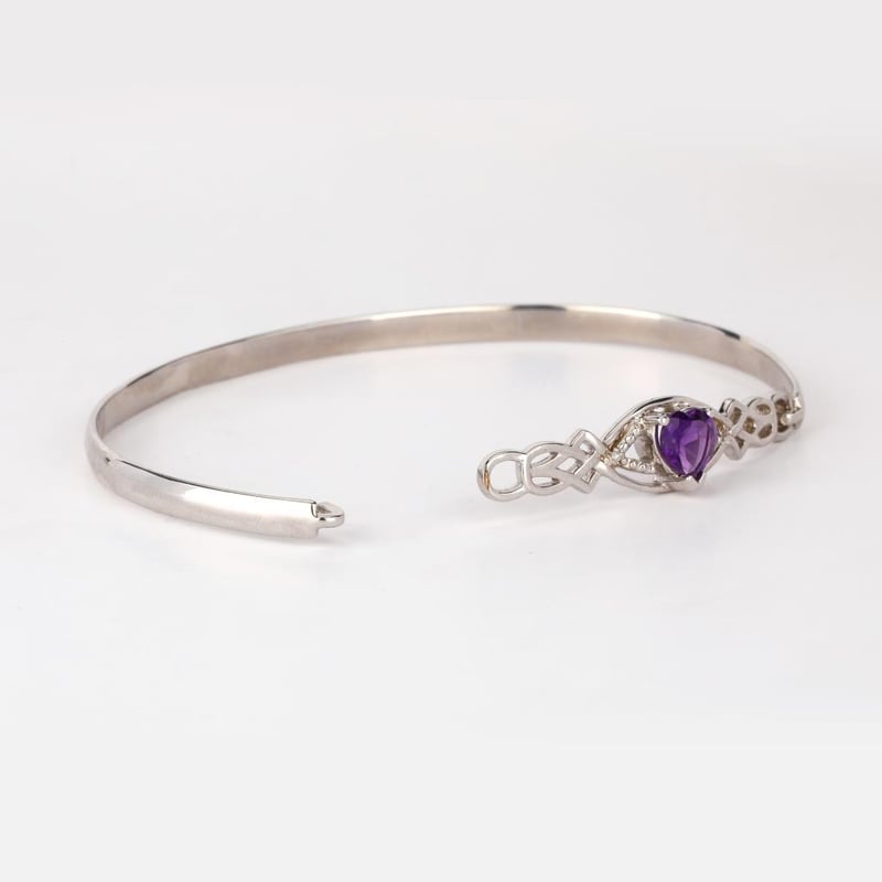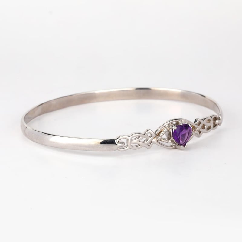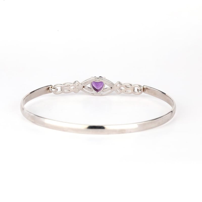 Indulge in the allure of this exquisite bangle, a true expression of love and elegance. Crafted with a stunning heart-shaped African Amethyst, measuring 7.00mm, this piece captures the essence of royalty with its deep, mesmerizing violet hue. Set against a backdrop of lustrous metal, the amethyst is beautifully complemented by two scintillating round white diamonds, each measuring 0.90mm. These diamonds sparkle with an ethereal brilliance, adding a touch of sophistication and glamour to the design.