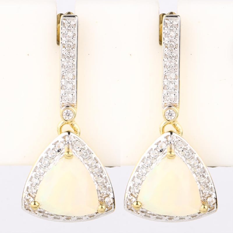 Ethereal Ethiopian Opal Trillion Earrings with Dazzling White Zircon AccentsIndulge in the enchanting allure of these exquisite earrings featuring the mesmerizing beauty of Ethiopian opals. Each trillion-cut opal, measuring 7.00mm, radiates a kaleidoscope of vibrant colors, reminiscent of a sunlit opal field. Their unique play-of-color dances gracefully with every movement, capturing the light in a way that is simply spellbinding.Surrounding these captivating opals are a total of 62 brilliant white zircons—2 round-cut stones at 1.20mm and 60 round-cut stones at 1.00mm—which add a touch of elegance and sparkle that perfectly complements the opals. The harmonious blend of colors and brilliance creates a stunning visual symphony that is sure to turn heads and capture hearts.Crafted with meticulous attention to detail, these earrings are not just a piece of jewelry; they are an experience, an expression of luxury that embodies sophistication and grace. Perfect for special occasions or as a statement piece for everyday wear, these earrings are destined to become a treasured addition to your collection. Adorn yourself with these extraordinary creations and let their beauty illuminate your unique style.