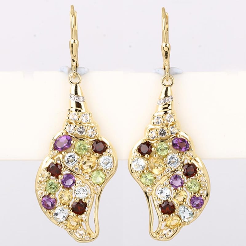 Vibrant Symphony of Color: Exquisite Multi-Gemstone EarringsIndulge in the opulence of these mesmerizing earrings, a true testament to the art of fine jewelry craftsmanship. Each piece is a harmonious blend of nature's most vibrant gems, meticulously curated to create a kaleidoscope of color and elegance that will elevate any ensemble.At the heart of these earrings are six stunning round garnets, each 3.00mm, radiating a deep, fiery red that symbolizes passion and vitality. Complementing this bold hue are six round peridots, their 3.00mm stones exuding a fresh, zesty green reminiscent of sunlit meadows. The allure continues with four captivating round African amethysts, each 3.00mm, showcasing their regal purple tones that evoke a sense of serene luxury.Adding a touch of tranquility, the dazzling blue topaz stones, also in 3.00mm, bring a refreshing splash of sky blue, while four oval citrines, each measuring 4x3mm, infuse the design with their warm, sunny yellow glow. The composition is further enhanced by two oval African amethysts and two oval blue topaz stones, both 4x3mm, creating a cascading effect of color that dances with light.The brilliance of this design is accentuated by a generous sprinkling of white topaz, featuring an array of sizes from 1.90mm to a delicate 0.80mm. These shimmering accents serve to reflect and amplify the vibrant colors of the featured gemstones, ensuring that every angle reveals a new facet of beauty.Perfect for any occasion, these earrings are not just accessories; they are an experience. Slip them on for a night out, or wear them to add a touch of sophistication to your everyday style. Adorned with nature’s finest treasures, these earrings promise to be a cherished addition to any jewelry collection, capturing the essence of elegance and individuality. Don’t miss the opportunity to own this remarkable piece of art; let it be the statement of your style and the jewel of your collection.