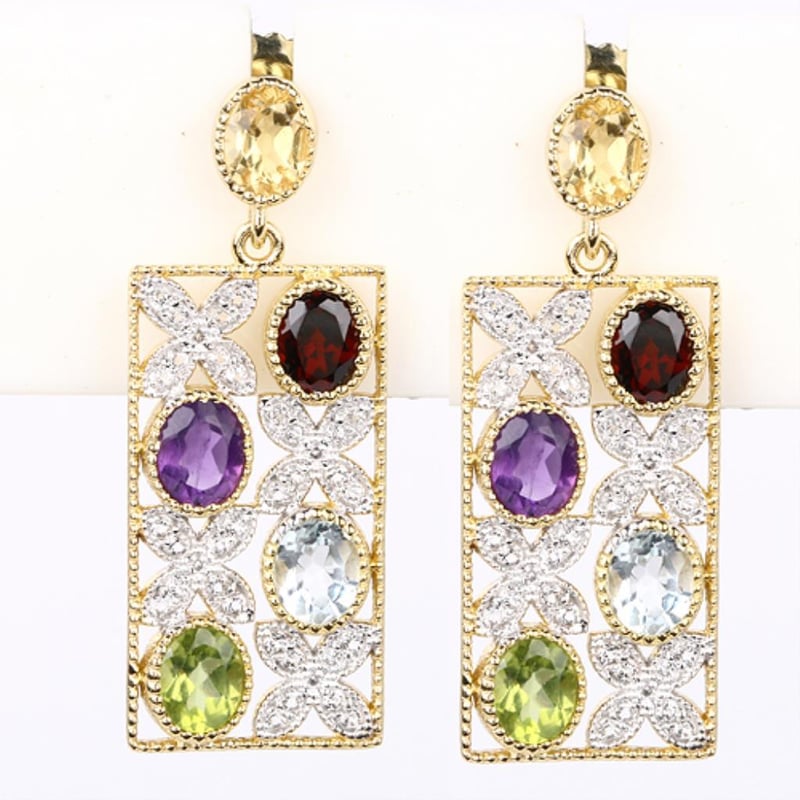 Elevate your elegance with this exquisite pair of earrings, a true celebration of nature's vibrant palette. Each earring features a stunning array of gemstones, meticulously arranged to create a symphony of color and light.