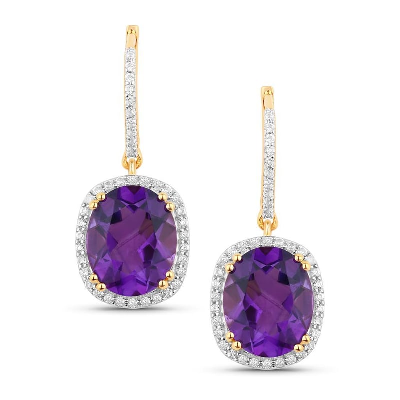 Majestic Elegance: African Amethyst and White Zircon EarringsIndulge in a symphony of color and brilliance with these exquisite earrings that embody the essence of sophistication and luxury. Crafted with two stunning African Amethyst ovals, each measuring an impressive 11x9mm, these gems captivate the eye with their rich, deep purple hue — a color revered for its regal allure and calming properties. The amethysts are masterfully complemented by a halo of 96 shimmering round white zircons, each 1.00mm in size, that dance in the light, adding a radiant sparkle that enhances the overall elegance of the design.The harmonious blend of the vibrant amethyst and the scintillating zircon creates a striking contrast that is perfect for any occasion, whether it be an intimate gathering or a grand soirée. Meticulously crafted and thoughtfully designed, these earrings are not just accessories; they are statements of style and grace.Elevate your jewelry collection with this pair of captivating earrings that promise to turn heads and spark conversations, making them a timeless addition to your ensemble. Experience the allure of these precious stones and let your elegance shine through effortlessly.