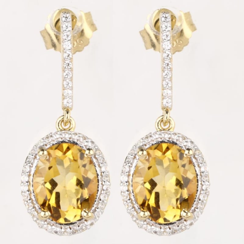 Adorning each earring are 80 shimmering round white zircon stones, each 1.00mm in size, meticulously set to create a dazzling halo effect around the citrine. The brilliant sparkle of the zircon enhances the rich tones of the citrine, resulting in a harmonious blend that captures both light and attention.