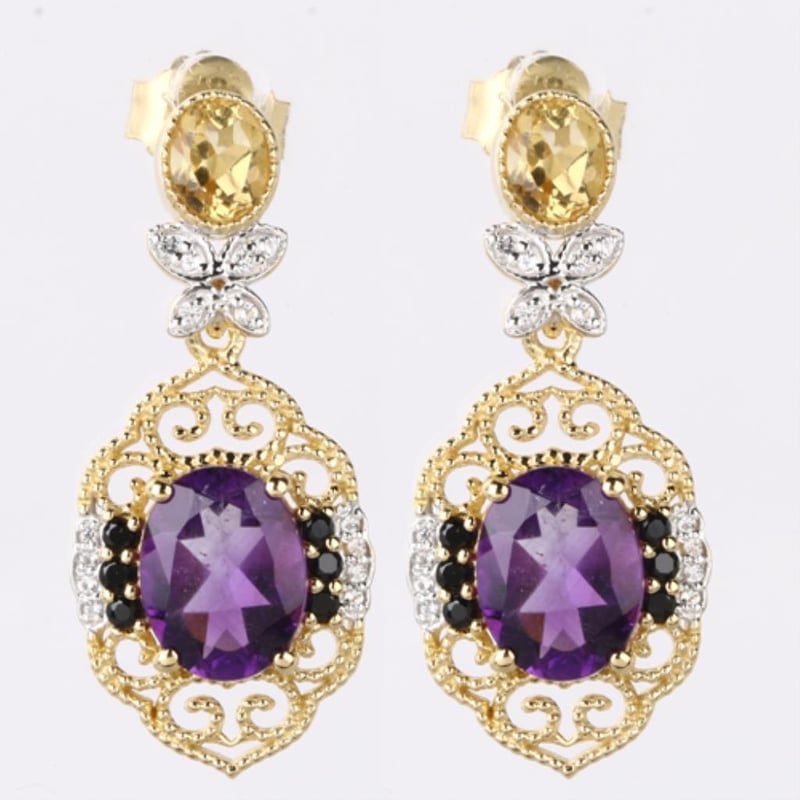 Enchanting Elegance: A Symphony of Colors in Dazzling EarringsIndulge in the splendor of these exquisite earrings, a true celebration of nature's finest gemstones. Each piece is meticulously crafted to showcase a harmonious blend of luxurious African amethyst and vibrant citrine, beautifully complemented by the shimmering allure of black spinel and white topaz. At the heart of these earrings lie two stunning African amethyst ovals, measuring 9x7mm, radiating a rich, regal purple that captures the essence of elegance. Flanking these are two captivating citrine ovals, 5x4mm in size, their golden hues evoking warmth and joy. Each gemstone is artfully surrounded by a constellation of 12 round black spinels, measuring 1.50mm, and an array of radiant white topaz—12 pieces at 1.10mm and 16 pieces at 0.90mm—adding layers of brilliance and sparkle.Designed for the discerning connoisseur, these earrings are not just accessories; they are a statement of sophistication and style. Perfect for an evening gala or a luxurious day out, they promise to elevate any ensemble, making you the center of attention. Embrace the allure of this spectacular jewelry set, where each gemstone tells a story of beauty and craftsmanship, destined to be cherished for generations.