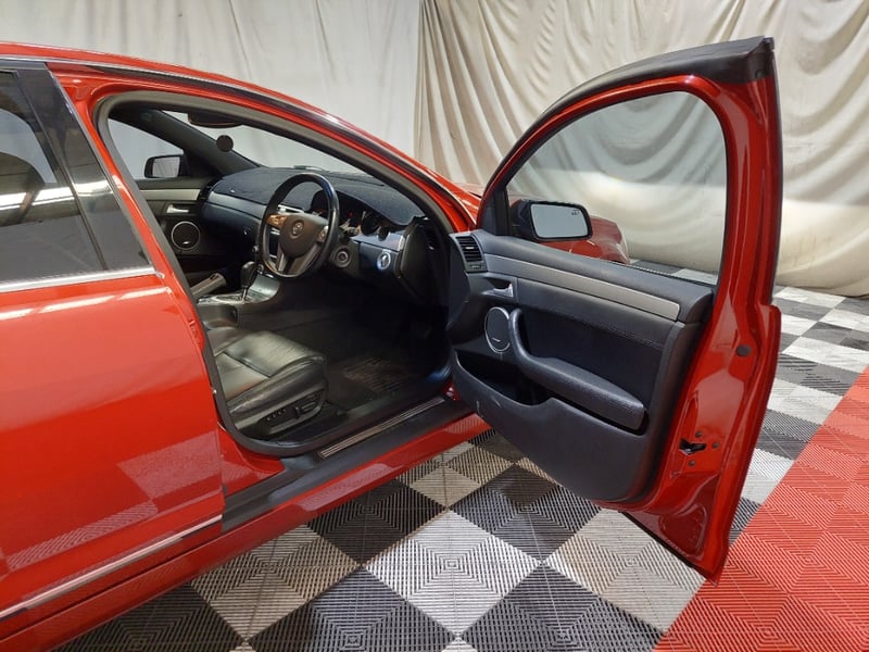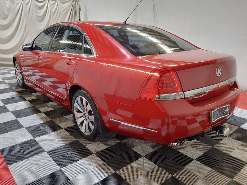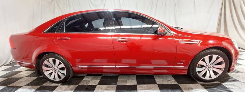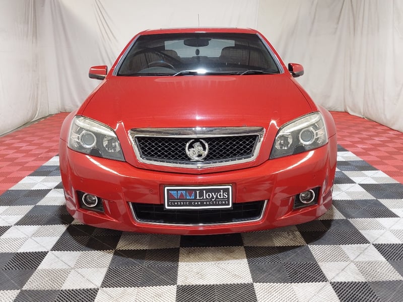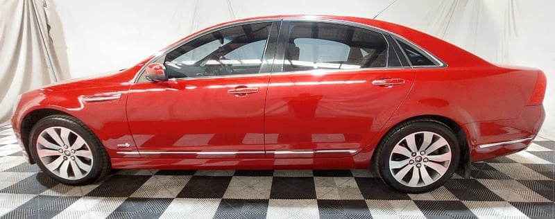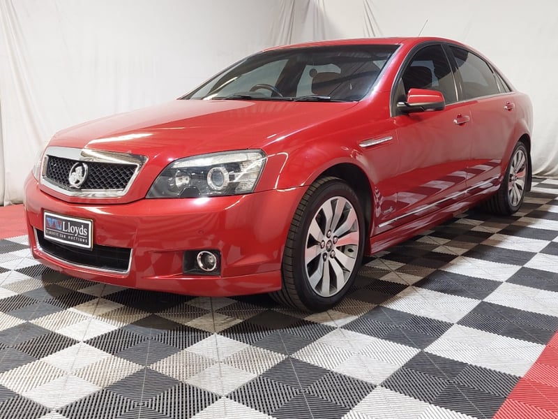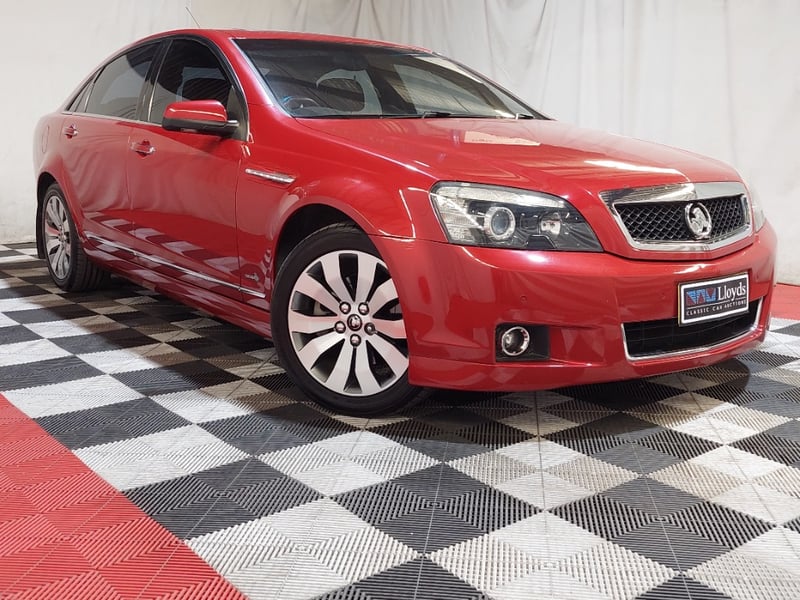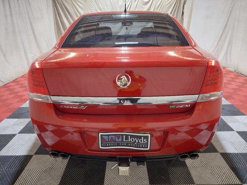 2010 Holden VE Caprice V four-door sedan finished in red. Rear-wheel drive luxury performance sedan powered by a 6.0‑litre V8 petrol engine paired with an automatic transmission. Odometer indicating 208,500 kilometres.