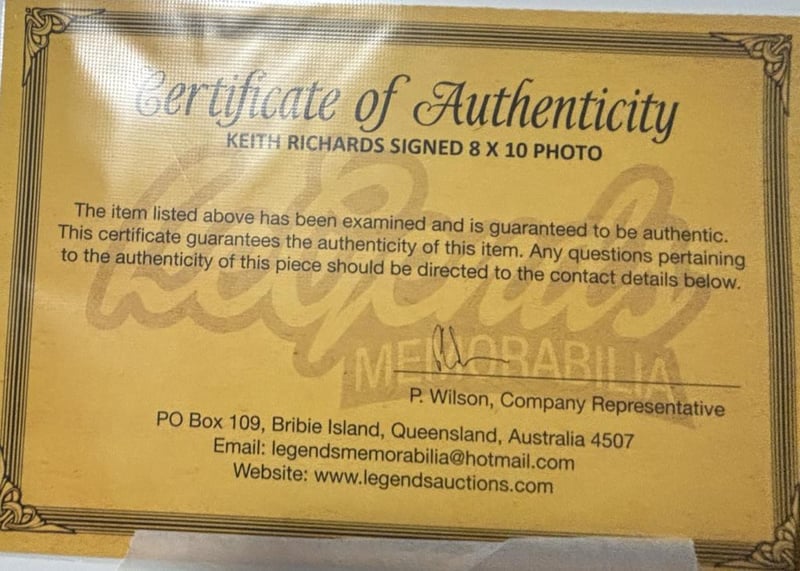 ROLLING STONES LEGEND KEITH RICHARDS SIGNED & FRAMED Keith Richards Personally Signed 8 X 10 Photo. The Photo Has Been Framed With Two Unsigned Action Photos Of The Star Quarterback And Plaque. Measuring 800 X 440, This Is Ready To Hang.The Item Is Accompanied By A Certificate Of Authenticity. Condition: Good - Refer To Images 585045+72