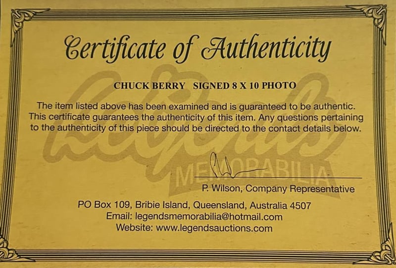 Chuck Berry Personally Signed 8 X 10 Photo. Chuck Berry Was An American Guitarist, Singer, And Songwriter, And One Of The Pioneers Of Rock And Roll. The Item Is Accompanied By A Certificate Of Authenticity.
