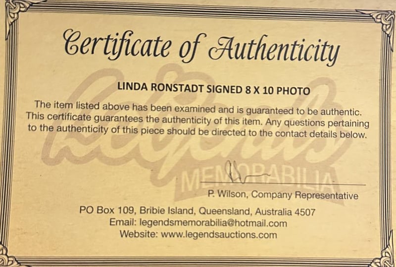 LINDA RONSTADT SIGNED PHOTO Linda Ronstadt Personally Signed 8 X 10 Photo. Linda Ronstadt Is An American Former Singer And Musician Who Has Performed And Recorded In A Diverse Range Of Genres, Including Rock, Folk, Pop, Country, And Soul. The Item Is Accompanied By A Certificate Of Authenticity. Condition: Good - Refer To Images 585045+62