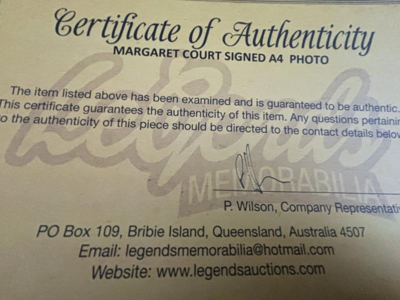 Margaret Court Personally Signed A4 Photo. Margaret Court Is A Former Australian World Number 1 Tennis Player. The Item Is Accompanied By A Certificate Of Authenticity.