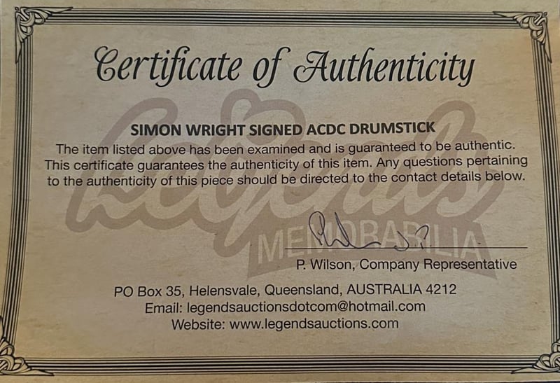 Simon Wright Personally Signed Ac/Dc Drumstick. Simon Wright Is An English Drummer Best Known For His Work With Rock Bands Ac/Dc And Dio. The Item Is Accompanied By A Certificate Of Authenticity.