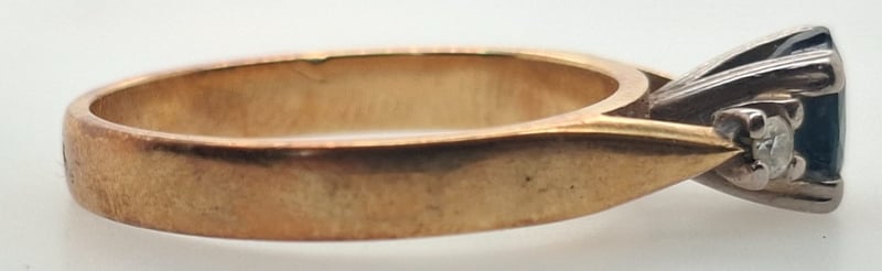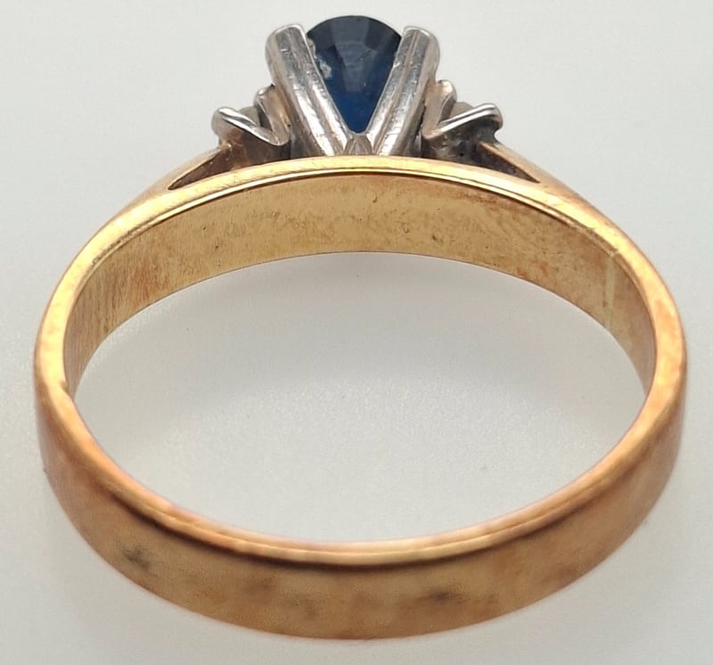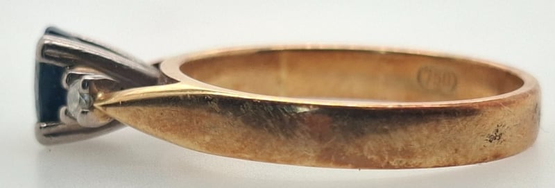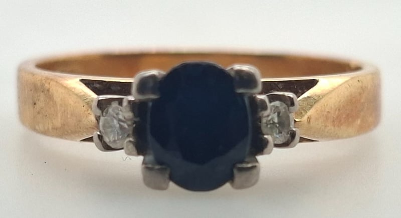 18K YELLOW GOLD SAPPHIRE AND DIAMOND RING Ring Features One Oval Cut Sapphire In Four Style Claw Centrepiece, Two Riund Cut Diamonds In Ring Shoulder Settings Total Item Weight: 4.40g Markings: Stamped: 750 Condition: Good - Refer To Images 585048+16