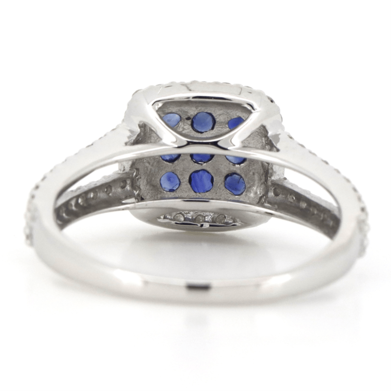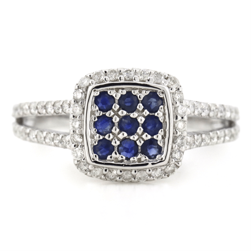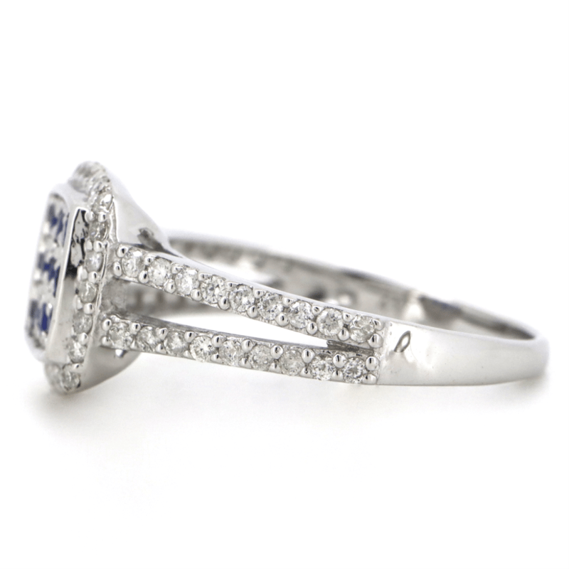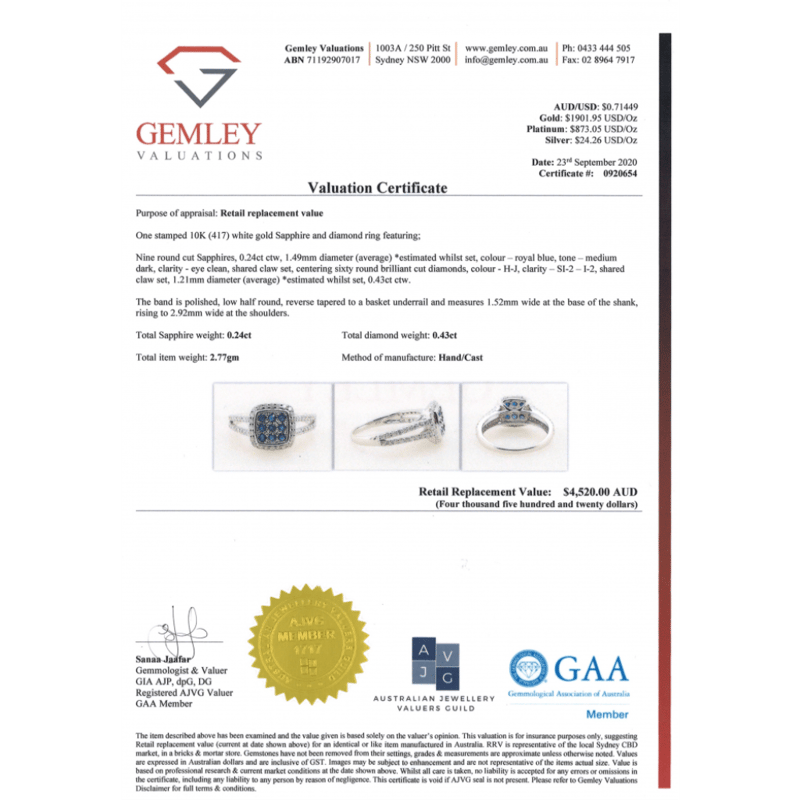 10K WHITE GOLD, BLUE SAPPHIRE AND DIAMOND, DECORATIVE SPLIT BAND RING. The Central Design Features, 9 Round Cut, Medium-Dark Royal-Blue, Sapphires (0.24Ct Tsw, Eye Clean Clarity), Shared Claw Set. Surrounding The Centre In A Halo And Decorating The Band Are, 60 Round Brilliant Cut, Diamonds (0.43Ct Tdw, H-J Colour, Si2-I2 Clarity), Shared Claw Set. Ring Size N. Valuations Provided by an Independent Third-Party Professional Not Directly Associated With Lloyds Auctions at AUD $$4,520.00This valuation has been conducted by an independent third-party professional. The valuation amount is an assessment by the issuing valuer and does not reflect the auction value of the item. Any inquiries regarding the valuation should be directed to the issuing valuer (refer to contact details on the certificate), as Lloyds Auctions has no affiliation or influence over the valuation, the valuer, or the stated amount. Condition: Good - Refer Images 0+1498