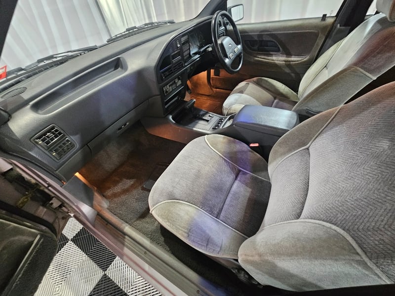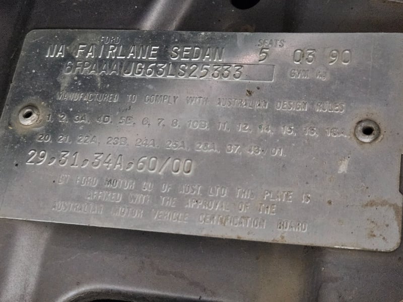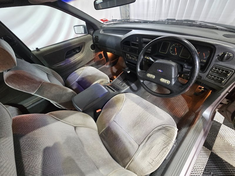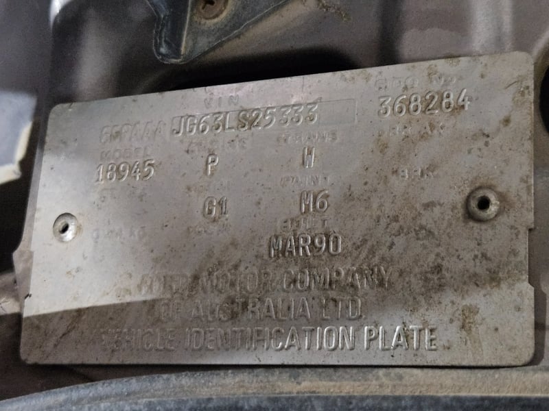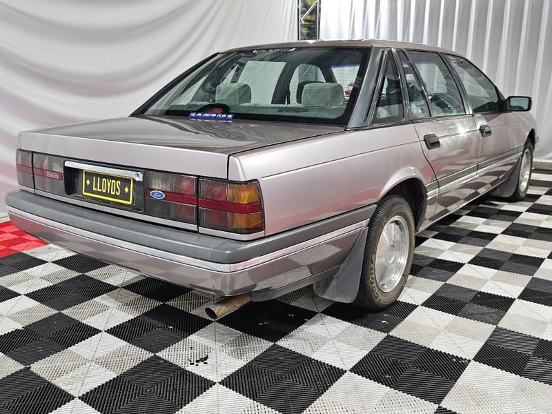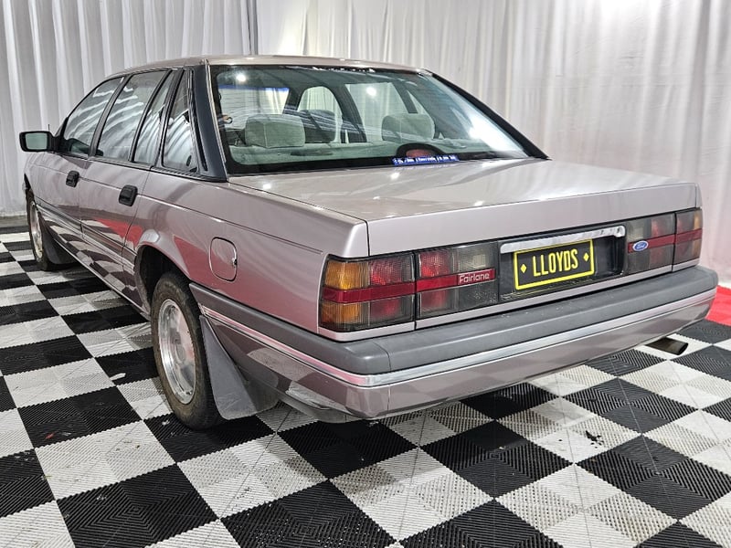 1990 Ford Fairlane NC II four‑door sedan finished in Mushroom. Rear‑wheel drive configuration powered by a 4.0‑litre V6 petrol engine paired with an automatic transmission. Odometer indicating 855,771 kilometres.
