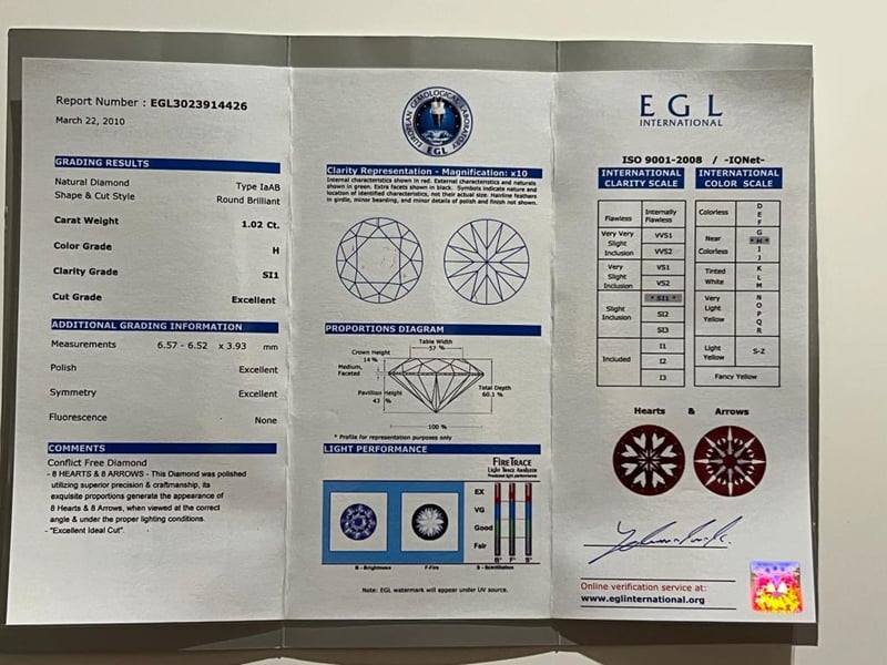 This Elegant Platinum Diamond Ring Features A 1.02Ct Round Brilliant Cut Diamond Set In A Classic 6-Claw Setting. The Diamond Is Egl Certified (Certificate Number Egl3023914426, Laser Inscribed 3023914426) And Was Graded On March 22, 2010. The Diamond Measures 6.57 X 6.52 X 3.93Mm And Showcases Excellent Craftsmanship With An H Colour, Si1 Clarity, Excellent Cut, Polish, And Symmetry, And No Fluorescence. Weighs 4.6 Grams, Ring Size O