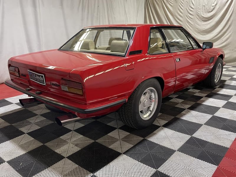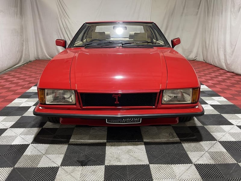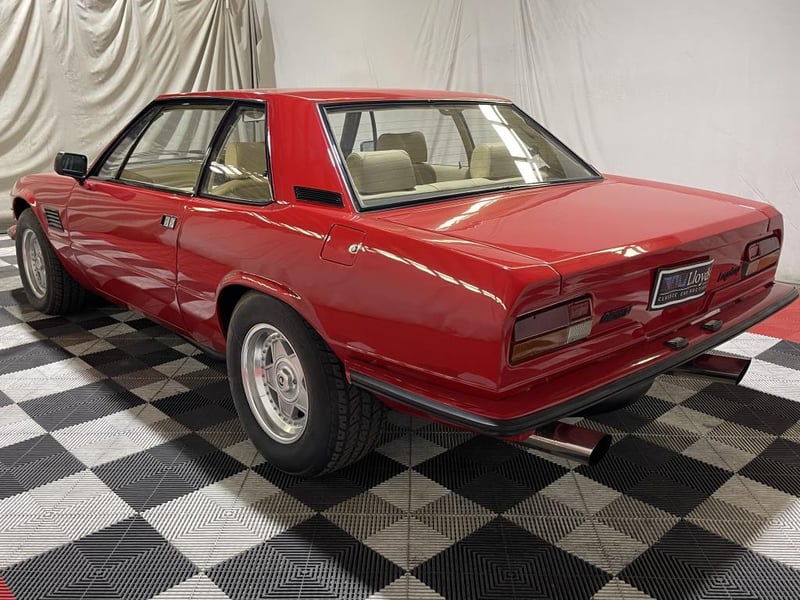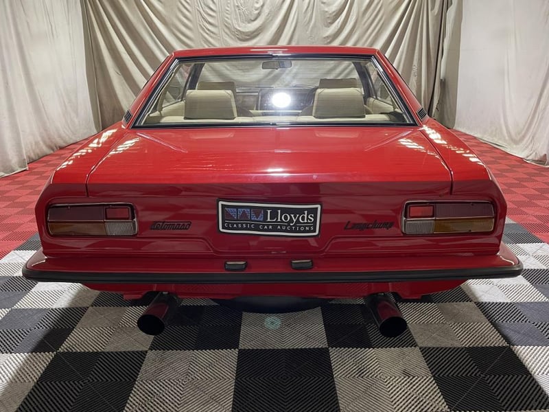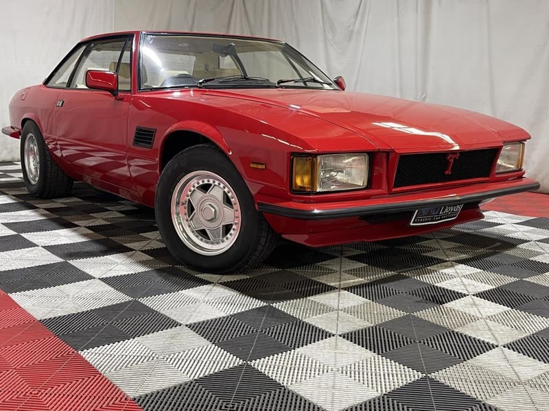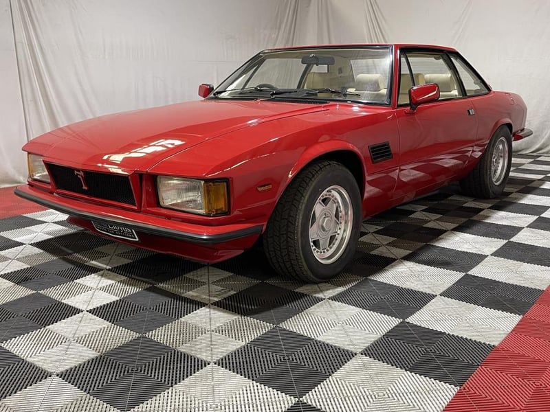 1979 De Tomaso Longchamp two-door coupe finished in red. Rear-wheel drive grand tourer powered by a 5.8-litre V8 petrol engine, paired with a rare four-speed manual transmission. Odometer indicating 84,128 miles.