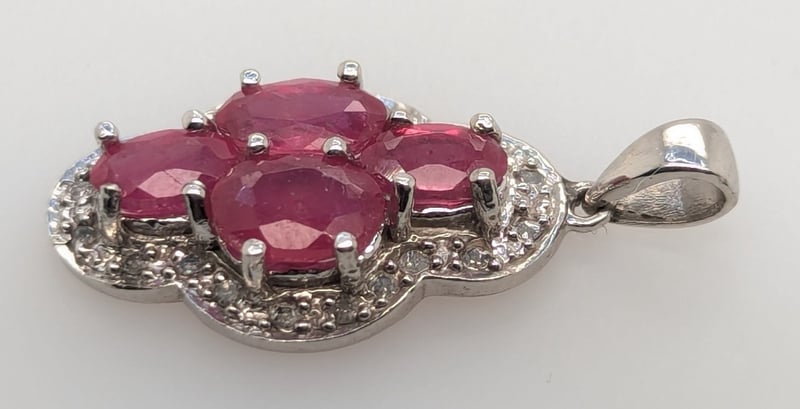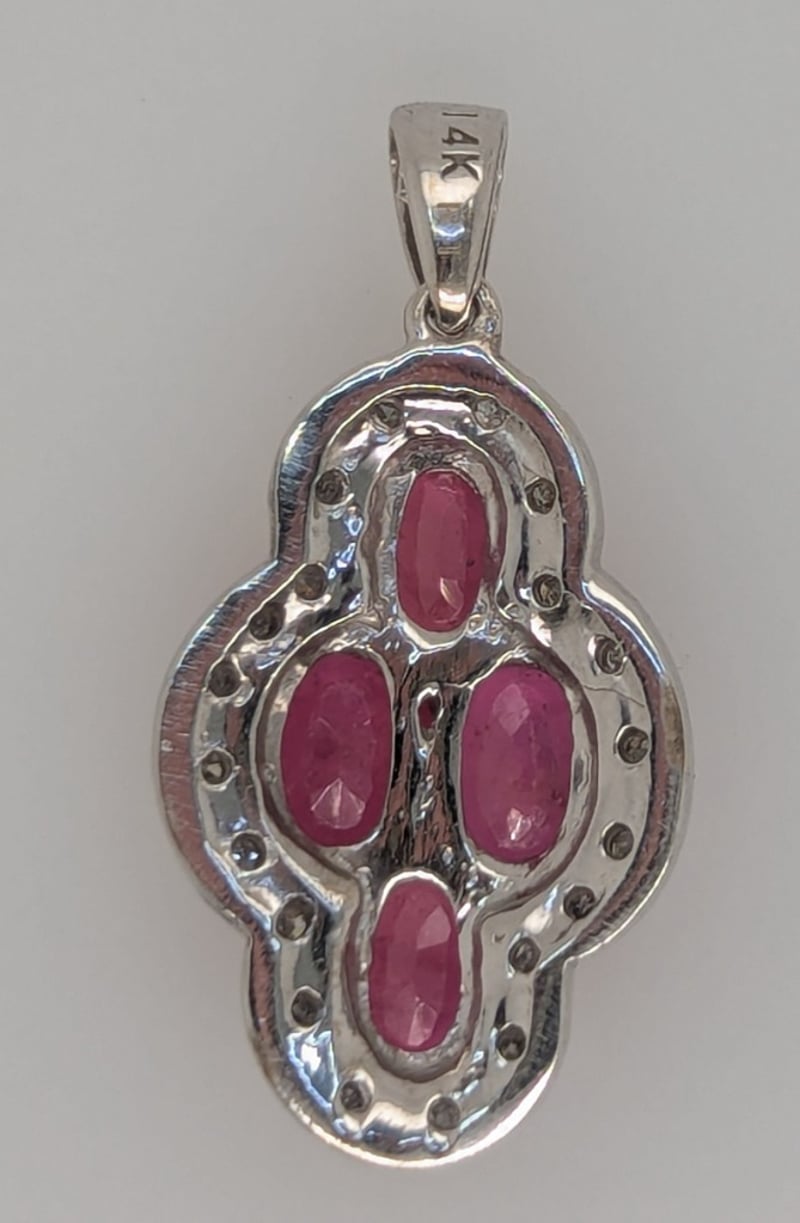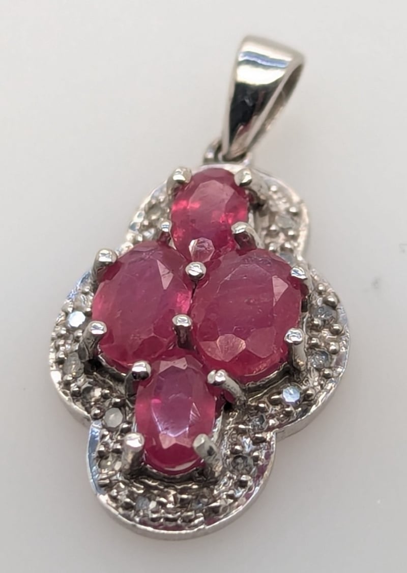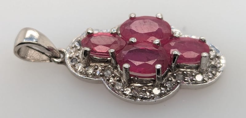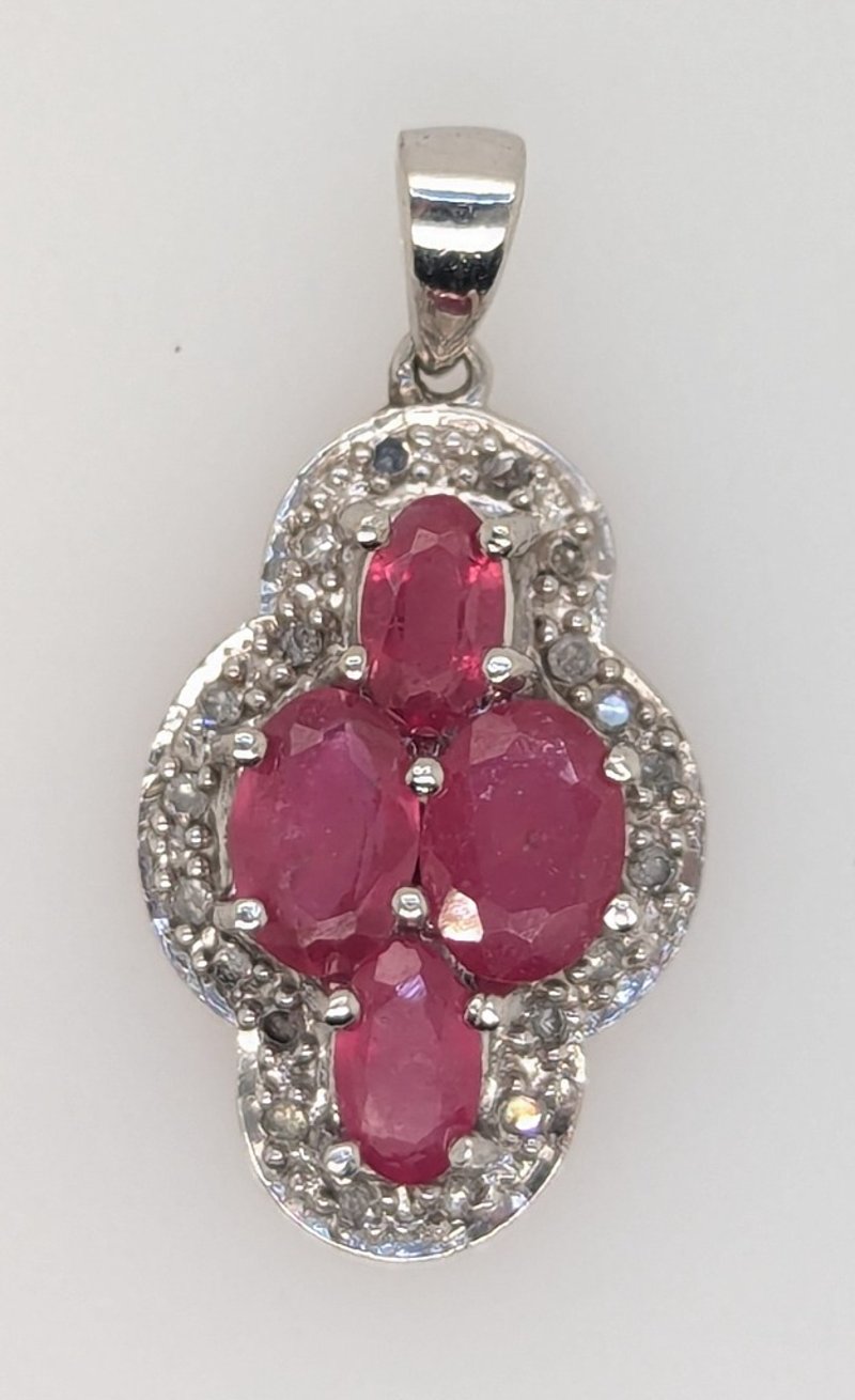 Pendant Features Four Oval Cut Red Psinel Gemstones In Four Claw Settings, Round Cut Sapphires Set Around Centre Settings