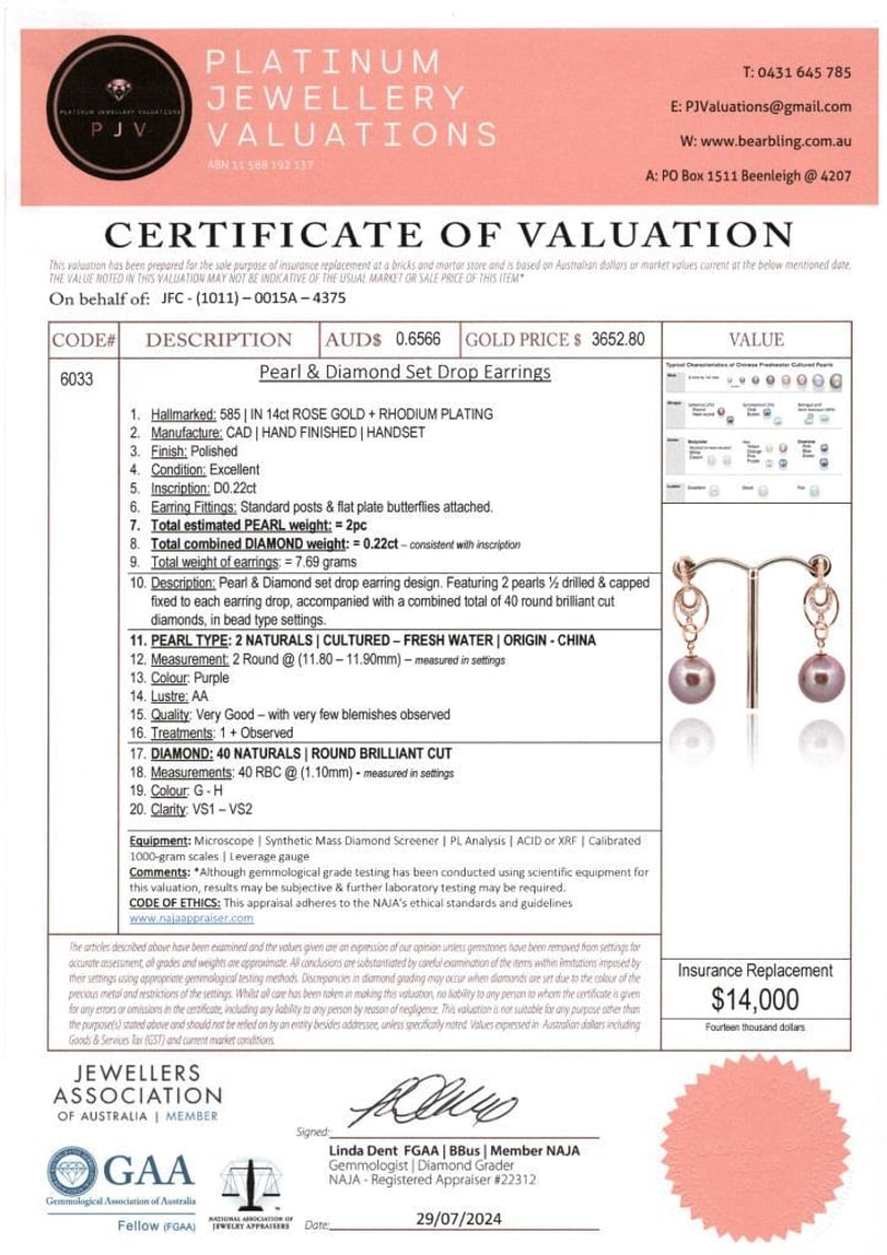 14CT ROSE GOLD PEARL AND DIAMOND DROP EARRINGS Featuring, 2 Round, Purple Cultured Fresh Water Pearls (11.80Mm-11.90Mm Sizes, Aa Grade), With 40 Round Brilliant Cut Diamonds (0.22Ct Tdw, G-H Colour, Vs1-Vs2 Clarity), Bezel/Bead Set. Valuations Provided by an Independent Third-Party Professional Not Directly Associated With Lloyds Auctions at AUD $14000This valuation has been conducted by an independent third-party professional. The valuation amount is an assessment by the issuing valuer and does not reflect the auction value of the item. Any inquiries regarding the valuation should be directed to the issuing valuer (refer to contact details on the certificate), as Lloyds Auctions has no affiliation or influence over the valuation, the valuer, or the stated amount. Condition: Good - Refer Images 0586374+1778