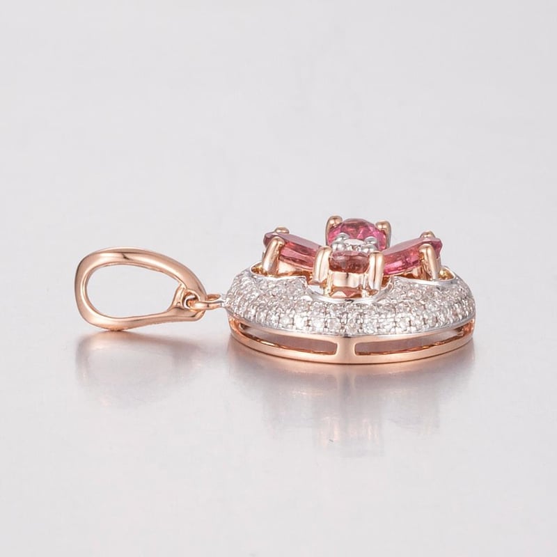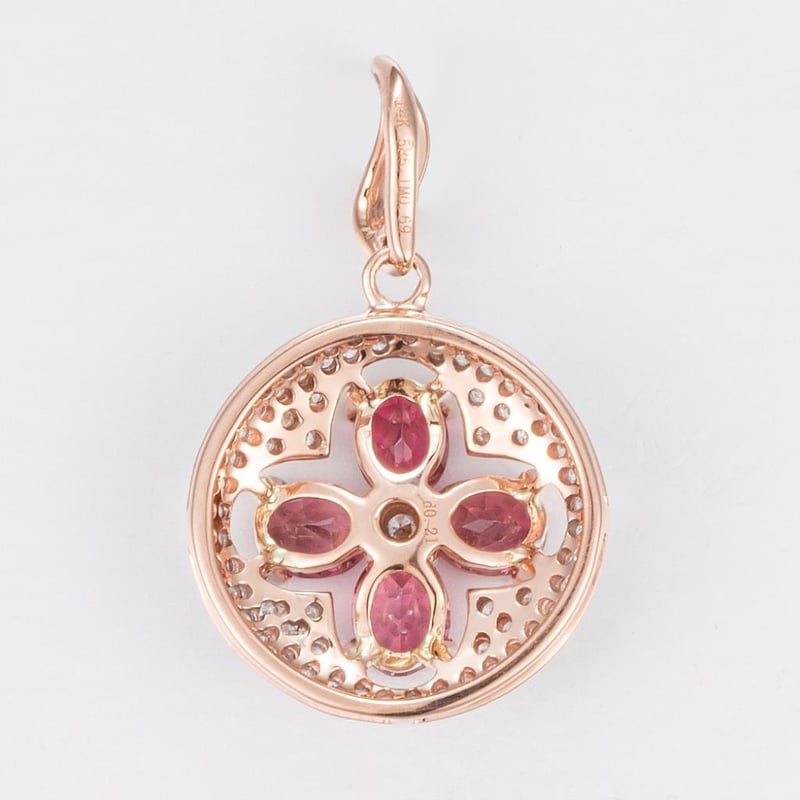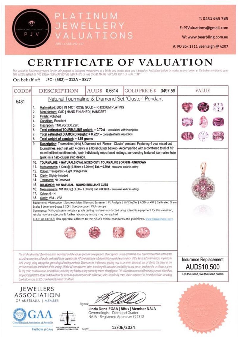 14CT ROSE GOLD TOURMALINE AND DIAMOND CLUSTER PENDANT Featuring Centre, 4 Oval Cut, Light Orange Pink Tourmalines (0.70Ct Tsw, Slightly Included), Claw Set, With 101 Round Brilliant Cut Diamonds (0.22Ct Tdw, G-H Colour, Vs1-Vs2 Clarity), Micro Bead Set. Valuations Provided by an Independent Third-Party Professional Not Directly Associated With Lloyds Auctions at AUD $10500This valuation has been conducted by an independent third-party professional. The valuation amount is an assessment by the issuing valuer and does not reflect the auction value of the item. Any inquiries regarding the valuation should be directed to the issuing valuer (refer to contact details on the certificate), as Lloyds Auctions has no affiliation or influence over the valuation, the valuer, or the stated amount. Condition: Good - Refer Images 0586374+1771