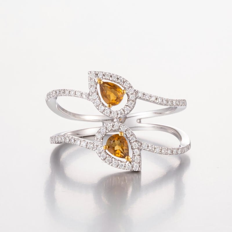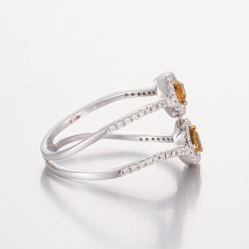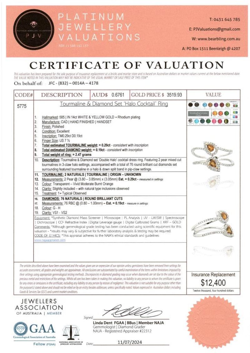 14CT WHITE GOLD TOURMALINE AND DIAMOND SPLIT RING, Featuring Centre, 2 Pear Cut, Vivid Moderate Burnt Orange Tourmalines (0.29Ct Tsw, Slightly Included), Claw Set, With 76 Round Brilliant Cut Diamonds (0.19Ct Tdw, G-H Colour, Vs1-Vs2 Clarity), Bead Set. Ring Size O Valuations Provided by an Independent Third-Party Professional Not Directly Associated With Lloyds Auctions at AUD $12400This valuation has been conducted by an independent third-party professional. The valuation amount is an assessment by the issuing valuer and does not reflect the auction value of the item. Any inquiries regarding the valuation should be directed to the issuing valuer (refer to contact details on the certificate), as Lloyds Auctions has no affiliation or influence over the valuation, the valuer, or the stated amount. Condition: Good - Refer Images 0586374+1760