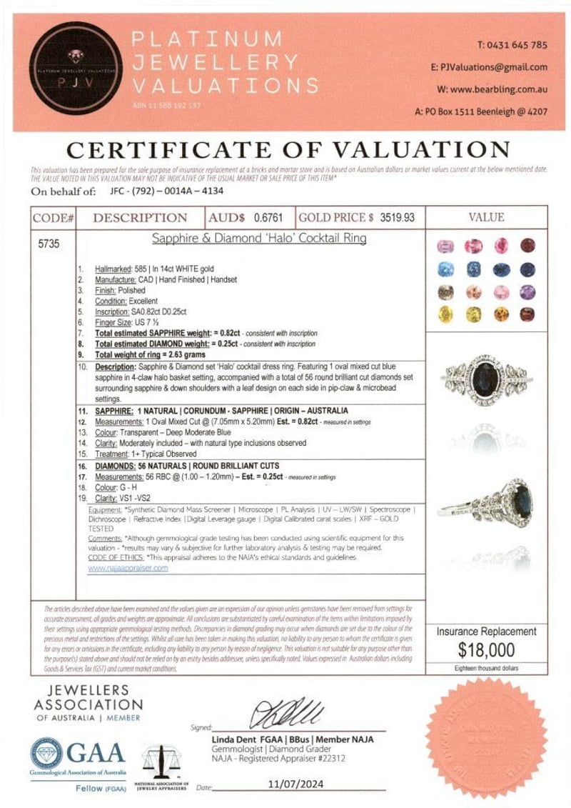 14CT WHITE GOLD AUSTRALIAN SAPPHIRE AND DIAMOND DRESS RING Featuring Centre, One Oval Cut, Deep Moderate Blue Australian Sapphire (0.82Ct Moderately Included), Claw Set, With 56 Round Brilliant Cut Diamonds (0.25Ct Tdw, G-H Colour, Vs1-Vs2 Clarity), Pip Claw Set. Ring Size O. Valuations Provided by an Independent Third-Party Professional Not Directly Associated With Lloyds Auctions at AUD $18000This valuation has been conducted by an independent third-party professional. The valuation amount is an assessment by the issuing valuer and does not reflect the auction value of the item. Any inquiries regarding the valuation should be directed to the issuing valuer (refer to contact details on the certificate), as Lloyds Auctions has no affiliation or influence over the valuation, the valuer, or the stated amount. Condition: Good - Refer Images 0586374+1787