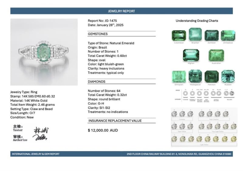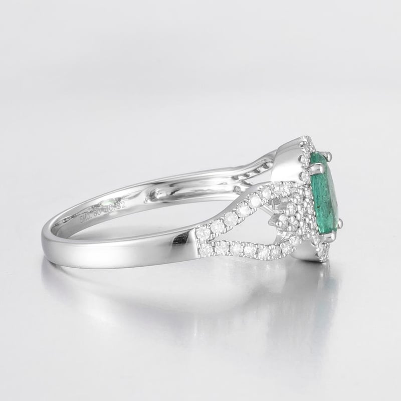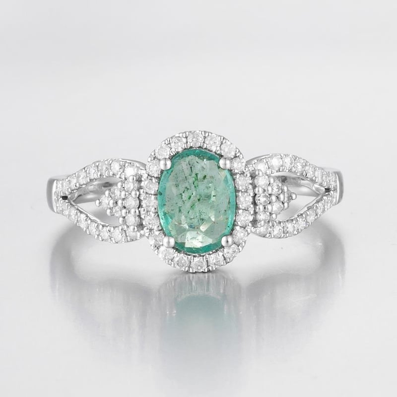 14CT WHITE GOLD BRAZILIAN EMERALD AND DIAMOND HALO RING Featuring Centre, One Oval Cut, Light Bluish-Green Brazilian Emerald (0.60Ct, Heavy Inclusions), Claw Set, With 64 Round Brilliant Cut Diamonds (0.32Ct Tdw, G-H Colour, Si1-Si2 Clarity), Bead Set. Ring Size O. Valuations Provided by an Independent Third-Party Professional Not Directly Associated With Lloyds Auctions at AUD $18000This valuation has been conducted by an independent third-party professional. The valuation amount is an assessment by the issuing valuer and does not reflect the auction value of the item. Any inquiries regarding the valuation should be directed to the issuing valuer (refer to contact details on the certificate), as Lloyds Auctions has no affiliation or influence over the valuation, the valuer, or the stated amount. Condition: Good - Refer Images 0586374+1763
