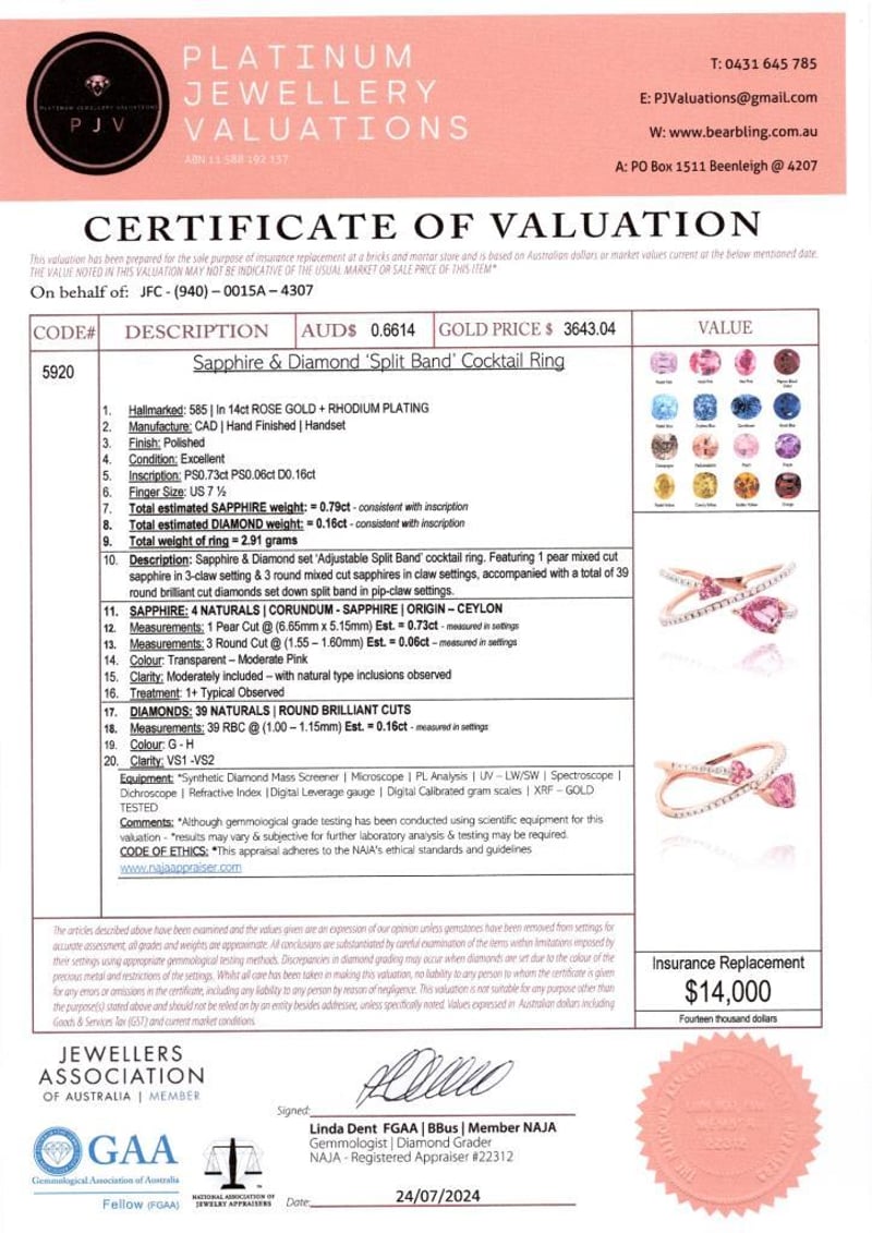 14CT ROSE GOLD PINK CEYLON SAPPHIRE AND DIAMOND SPLIT BAND RING Featuring Centre, One Pear And 3 Round Cut, Moderate Pink Ceylon Sapphires (0.79Ct Tsw, Moderately Included), Bead Set, With 39 Round Brilliant Cut Diamonds (0.16Ct Tdw, G-H Colour, Vs1-Vs2 Clarity), Bead Set. Ring Size O. Valuations Provided by an Independent Third-Party Professional Not Directly Associated With Lloyds Auctions at AUD $14000This valuation has been conducted by an independent third-party professional. The valuation amount is an assessment by the issuing valuer and does not reflect the auction value of the item. Any inquiries regarding the valuation should be directed to the issuing valuer (refer to contact details on the certificate), as Lloyds Auctions has no affiliation or influence over the valuation, the valuer, or the stated amount. Condition: Good - Refer Images 0586374+1764
