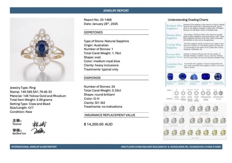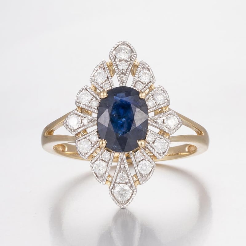 14CT YELLOW GOLD AUSTRALIAN SAPPHIRE AND DIAMOND ANTIQUE INSPIRED RING Featuring Centre, One Oval Cut, Medium Royal Blue Australian Sapphire (1.76Ct, Heavy Inclusions), Claw Set, With 24 Round Brilliant Cut Diamonds (0.33Ct Tdw, G-H Colour, Si1-Si2 Clarity), Bead Set. Ring Size O. Valuations Provided by an Independent Third-Party Professional Not Directly Associated With Lloyds Auctions at AUD $14200This valuation has been conducted by an independent third-party professional. The valuation amount is an assessment by the issuing valuer and does not reflect the auction value of the item. Any inquiries regarding the valuation should be directed to the issuing valuer (refer to contact details on the certificate), as Lloyds Auctions has no affiliation or influence over the valuation, the valuer, or the stated amount. Condition: Good - Refer Images 0586374+1767