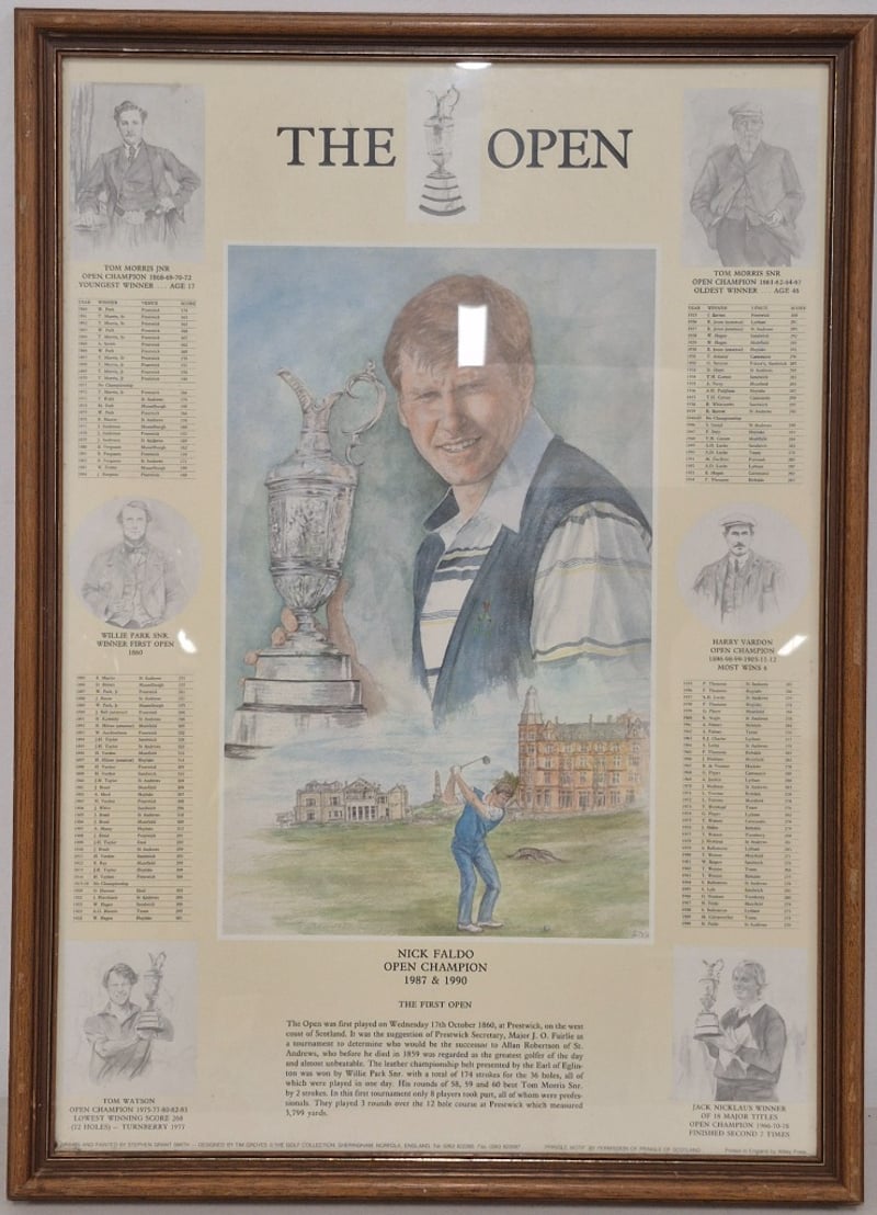 Framed Commemorative Poster Celebrating The Open Championship Golf Tournament, Featuring Nick Faldo As Open Champion In 1987 And 1990. Surrounded By Historical Open Champions Data And Sketched Portraits Of Legendary Golfers.